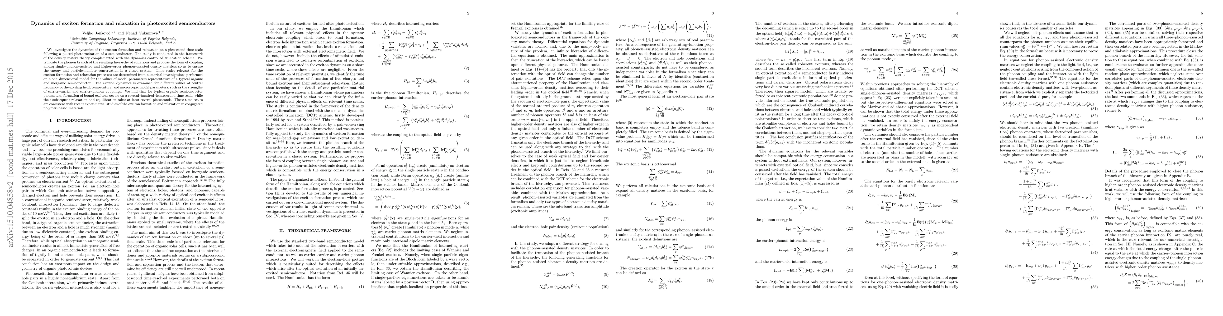 We investigate the dynamics of the exciton formation and relaxation on a picosecond time scale following a pulsed photoexcitation of a semiconductor. The study is conducted in the framework of the density matrix theory complemented with the dynamics controlled truncation scheme. We truncate the phonon branch of the resulting hierarchy of equations and propose the form of coupling among single-phonon-assisted and higher-order phonon-assisted density matrices so as to ensure the energy and particle-number conservation in a closed system. Time scales relevant for the exciton formation and relaxation processes are determined from numerical investigations performed on a one-dimensional model for the values of model parameters representative of a typical organic and inorganic semiconductor. The exciton dynamics is examined for different values of central frequency of the exciting field, temperature, and microscopic model parameters, such as the strengths of carrier-carrier and carrier-phonon couplings. We find that for typical organic semiconductor parameters, formation of bound excitons occurs on a several-hundred-femtosecond time scale, while their subsequent relaxation and equilibration takes at least several picoseconds. These time scales are consistent with recent experimental studies of the exciton formation and relaxation in conjugated polymer-based materials.