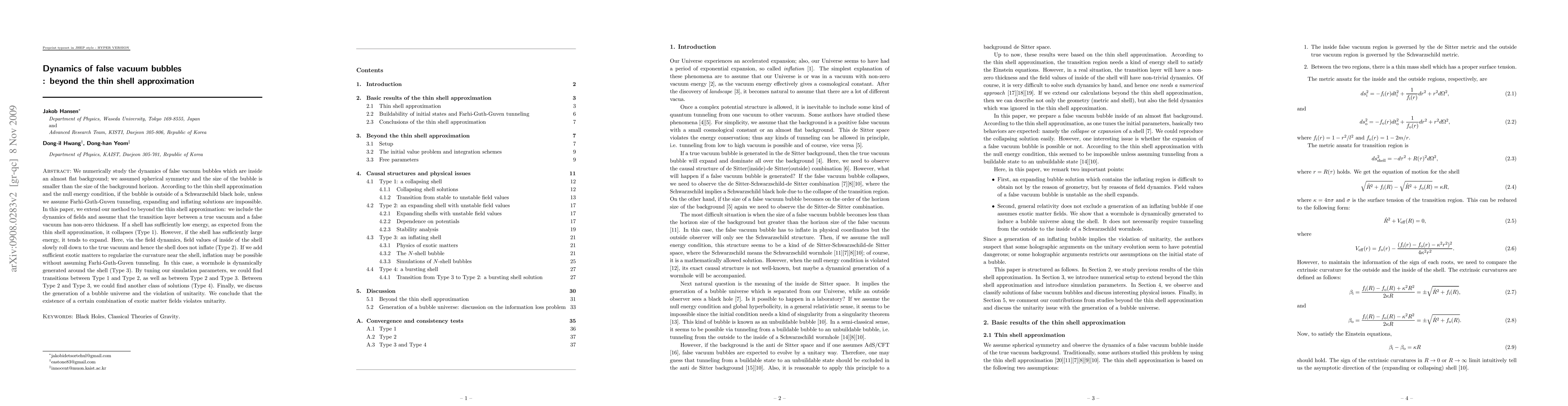 We numerically study the dynamics of false vacuum bubbles which are inside an almost flat background; we assumed spherical symmetry and the size of the bubble is smaller than the size of the background horizon. According to the thin shell approximation and the null energy condition, if the bubble is outside of a Schwarzschild black hole, unless we assume Farhi-Guth-Guven tunneling, expanding and inflating solutions are impossible. In this paper, we extend our method to beyond the thin shell approximation: we include the dynamics of fields and assume that the transition layer between a true vacuum and a false vacuum has non-zero thickness. If a shell has sufficiently low energy, as expected from the thin shell approximation, it collapses (Type 1). However, if the shell has sufficiently large energy, it tends to expand. Here, via the field dynamics, field values of inside of the shell slowly roll down to the true vacuum and hence the shell does not inflate (Type 2). If we add sufficient exotic matters to regularize the curvature near the shell, inflation may be possible without assuming Farhi-Guth-Guven tunneling. In this case, a wormhole is dynamically generated around the shell (Type 3). By tuning our simulation parameters, we could find transitions between Type 1 and Type 2, as well as between Type 2 and Type 3. Between Type 2 and Type 3, we could find another class of solutions (Type 4). Finally, we discuss the generation of a bubble universe and the violation of unitarity. We conclude that the existence of a certain combination of exotic matter fields violates unitarity.