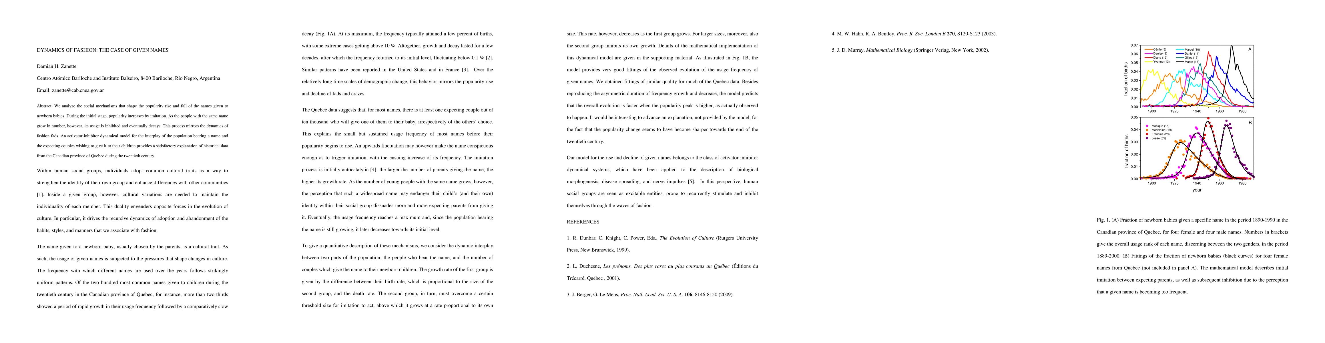 We analyze the social mechanisms that shape the popularity rise and fall of the names given to newborn babies. During the initial stage, popularity increases by imitation. As the people with the same name grow in number, however, its usage is inhibited and eventually decays. This process mirrors the dynamics of fashion fads. An activator-inhibitor dynamical model for the interplay of the population bearing a name and the expecting couples wishing to give it to their children provides a satisfactory explanation of historical data from the Canadian province of Quebec during the twentieth century.