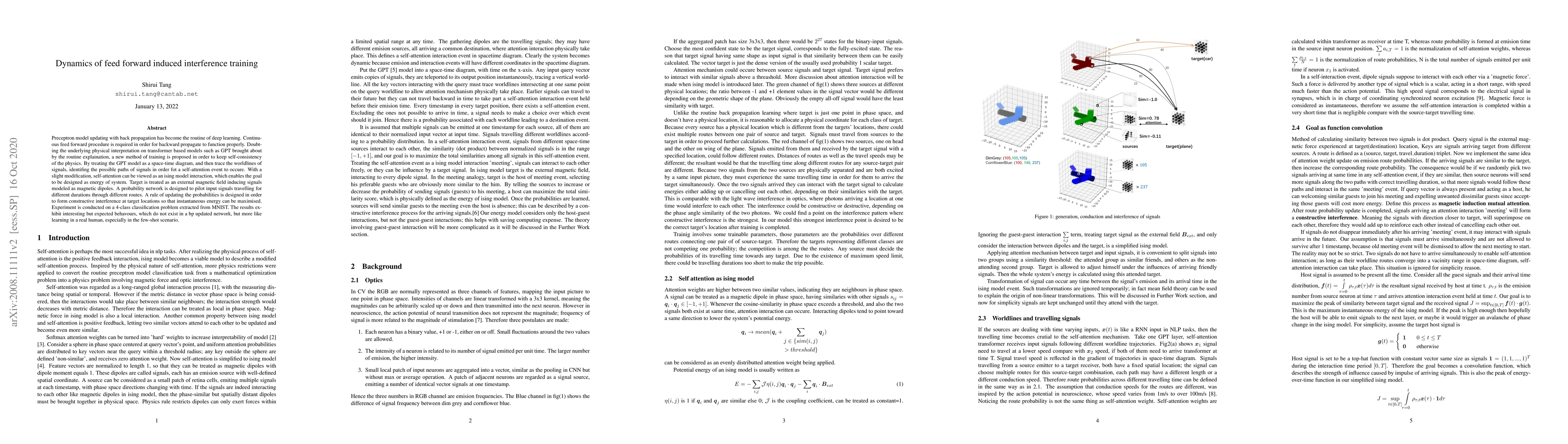 Preceptron model updating with back propagation has become the routine of deep learning. Continuous feed forward procedure is required in order for backward propagate to function properly. Doubting the underlying physical interpretation on transformer based models such as GPT brought about by the routine explaination, a new method of training is proposed in order to keep self-consistency of the physics. By treating the GPT model as a space-time diagram, and then trace the worldlines of signals, identifing the possible paths of signals in order fot a self-attention event to occure. With a slight modification, self-attention can be viewed as an ising model interaction, which enables the goal to be designed as energy of system. Target is treated as an external magnetic field inducing signals modeled as magnetic dipoles. A probability network is designed to pilot input signals travelling for different durations through different routes. A rule of updating the probabilities is designed in order to form constructive interference at target locations so that instantaneous energy can be maximised. Experiment was conducted on a 4-class classification problem extracted from MNIST. The results exhibit interesting but expected behavours, which do not exist in a bp updated network, but more like learning in a real human, especially in the few-shot scenario.