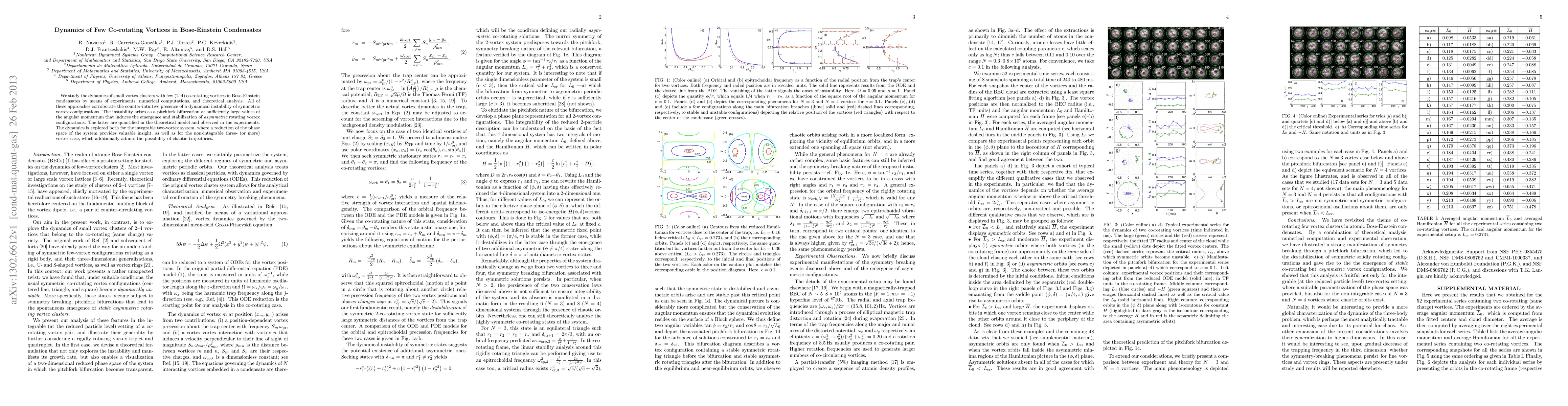 This study investigates the dynamics of small clusters of co-rotating vortices in Bose-Einstein condensates, revealing a dynamical instability in symmetric configurations that leads to asymmetric rotating vortex formations. Both experimental and theoretical analyses confirm this instability, which emerges via a pitchfork bifurcation at high angular momentum.