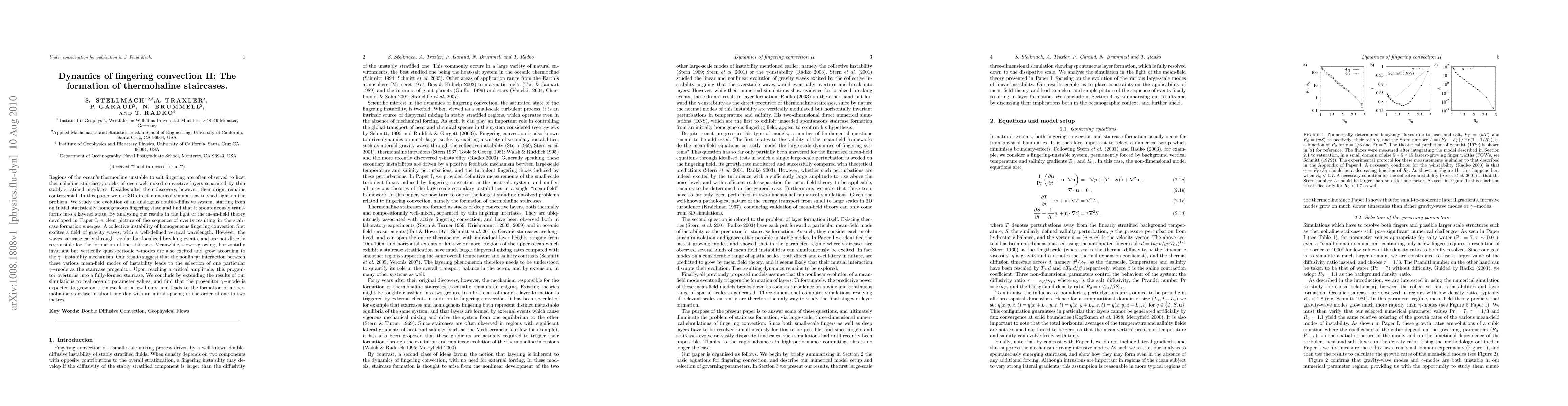 Regions of the ocean's thermocline unstable to salt fingering are often observed to host thermohaline staircases, stacks of deep well-mixed convective layers separated by thin stably-stratified interfaces. Decades after their discovery, however, their origin remains controversial. In this paper we use 3D direct numerical simulations to shed light on the problem. We study the evolution of an analogous double-diffusive system, starting from an initial statistically homogeneous fingering state and find that it spontaneously transforms into a layered state. By analysing our results in the light of the mean-field theory developed in Paper I, a clear picture of the sequence of events resulting in the staircase formation emerges. A collective instability of homogeneous fingering convection first excites a field of gravity waves, with a well-defined vertical wavelength. However, the waves saturate early through regular but localized breaking events, and are not directly responsible for the formation of the staircase. Meanwhile, slower-growing, horizontally invariant but vertically quasi-periodic gamma-modes are also excited and grow according to the gamma-instability mechanism. Our results suggest that the nonlinear interaction between these various mean-field modes of instability leads to the selection of one particular gamma-mode as the staircase progenitor. Upon reaching a critical amplitude, this progenitor overturns into a fully-formed staircase. We conclude by extending the results of our simulations to real oceanic parameter values, and find that the progenitor gamma-mode is expected to grow on a timescale of a few hours, and leads to the formation of a thermohaline staircase in about one day with an initial spacing of the order of one to two metres.
