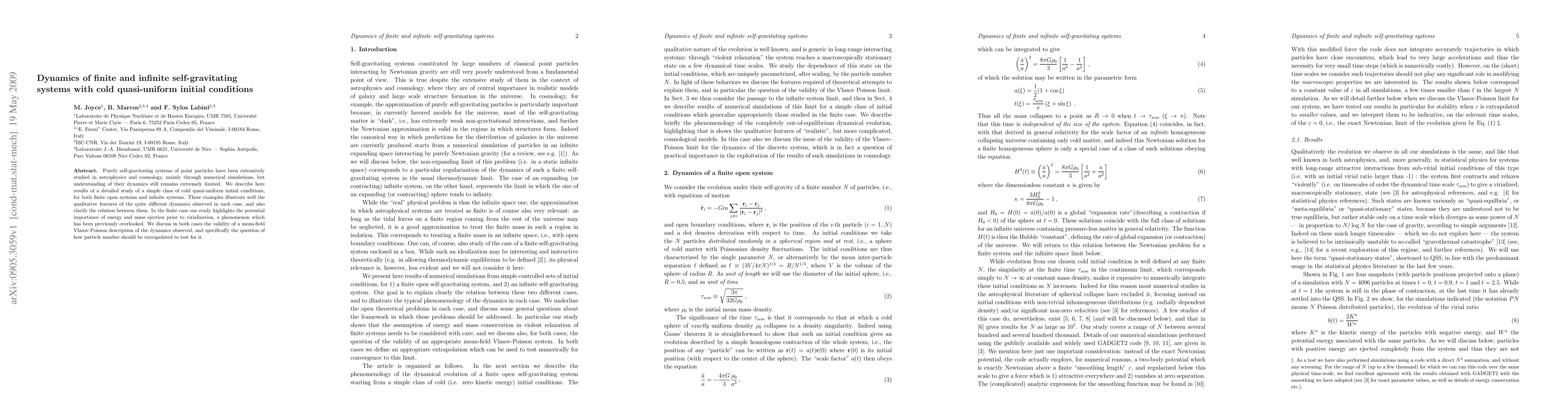 This paper investigates the dynamics of self-gravitating point particle systems under cold quasi-uniform initial conditions, comparing finite open systems and infinite systems. The study highlights the overlooked phenomenon of energy and mass ejection in finite systems before virialization and discusses the applicability of a mean-field Vlasov-Poisson description for both cases.