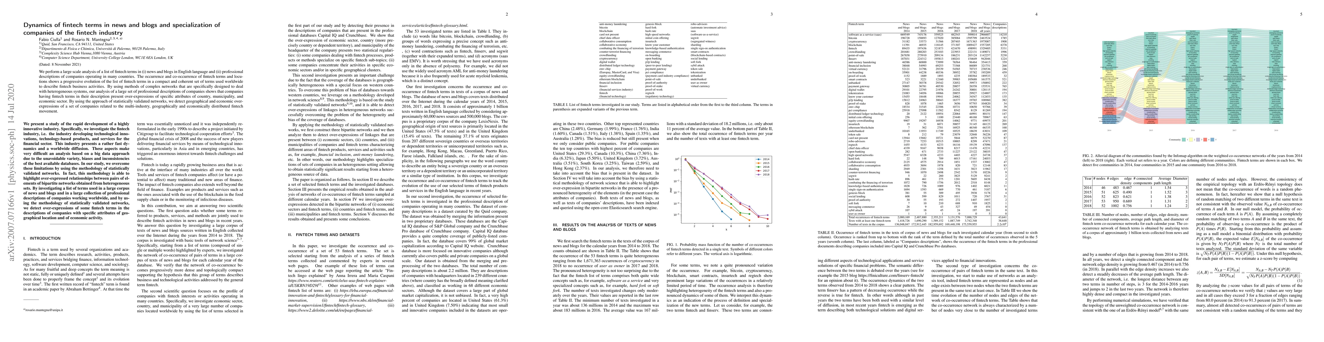 We perform a large scale analysis of a list of fintech terms in (i) news and blogs in English language and (ii) professional descriptions of companies operating in many countries. The occurrence and co-occurrence of fintech terms and locutions shows a progressive evolution of the list of fintech terms in a compact and coherent set of terms used worldwide to describe fintech business activities. By using methods of complex networks that are specifically designed to deal with heterogeneous systems, our analysis of a large set of professional descriptions of companies shows that companies having fintech terms in their description present over-expressions of specific attributes of country, municipality, and economic sector. By using the approach of statistically validated networks, we detect geographical and economic over-expressions of a set of companies related to the multi-industry, geographically and economically distributed fintech movement.