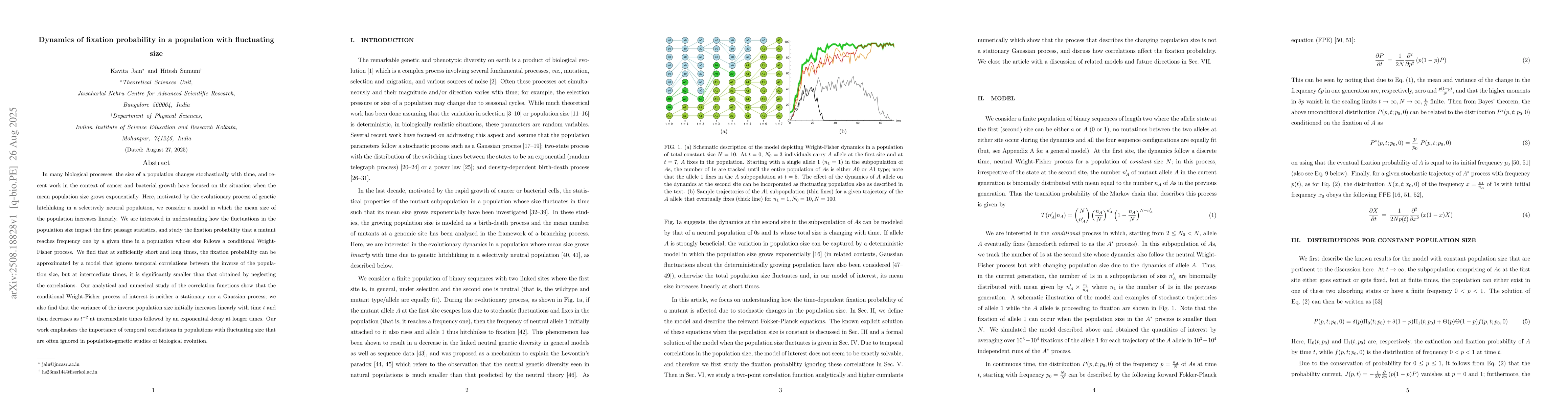 In many biological processes, the size of a population changes stochastically with time, and recent work in the context of cancer and bacterial growth have focused on the situation when the mean population size grows exponentially. Here, motivated by the evolutionary process of genetic hitchhiking in a selectively neutral population, we consider a model in which the mean size of the population increases linearly. We are interested in understanding how the fluctuations in the population size impact the first passage statistics, and study the fixation probability that a mutant reaches frequency one by a given time in a population whose size follows a conditional Wright-Fisher process. We find that at sufficiently short and long times, the fixation probability can be approximated by a model that ignores temporal correlations between the inverse of the population size, but at intermediate times, it is significantly smaller than that obtained by neglecting the correlations. Our analytical and numerical study of the correlation functions show that the conditional Wright-Fisher process of interest is neither a stationary nor a Gaussian process; we also find that the variance of the inverse population size initially increases linearly with time $t$ and then decreases as $t^{-2}$ at intermediate times followed by an exponential decay at longer times. Our work emphasizes the importance of temporal correlations in populations with fluctuating size that are often ignored in population-genetic studies of biological evolution.
