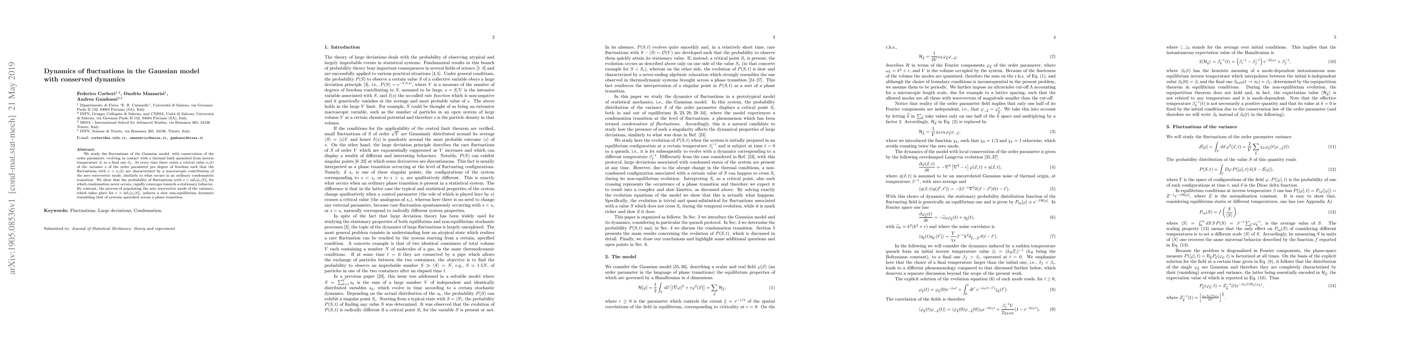 This paper investigates the fluctuations in the Gaussian model with conserved dynamics, focusing on the behavior when quenched from an initial to a final inverse temperature. It finds that fluctuations exceeding a critical variance value lead to macroscopic contributions akin to condensation transitions, while those below this threshold rapidly stabilize, contrasting with the slow dynamics seen in the population of the zero wavevector mode.