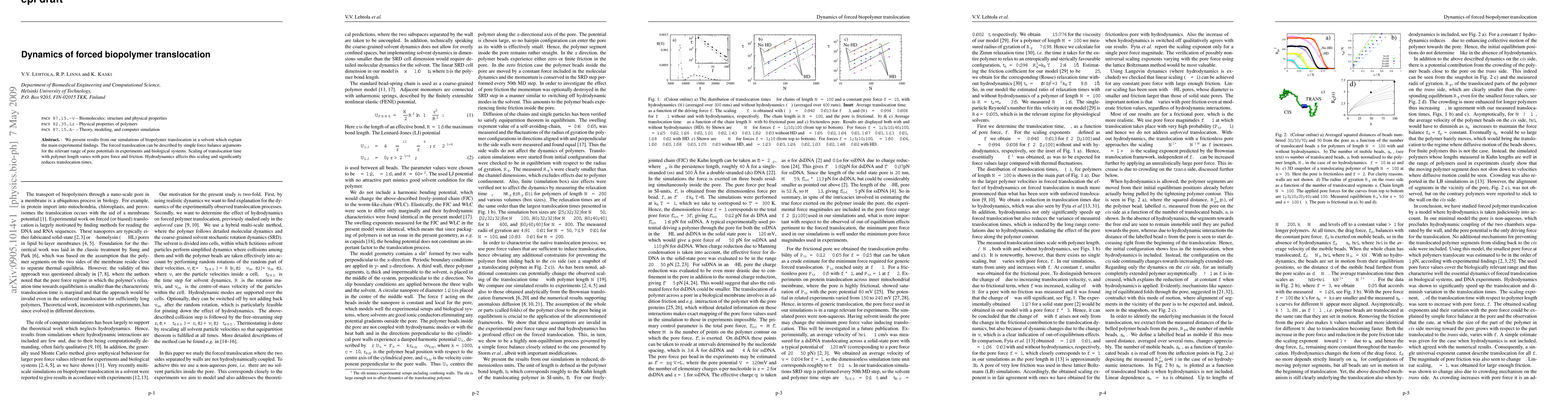This paper simulates the dynamics of biopolymer translocation through a solvent, explaining experimental observations. The study shows that forced translocation can be modeled using force balance, with scaling of translocation time dependent on pore force, friction, and hydrodynamics, which significantly reduces time.