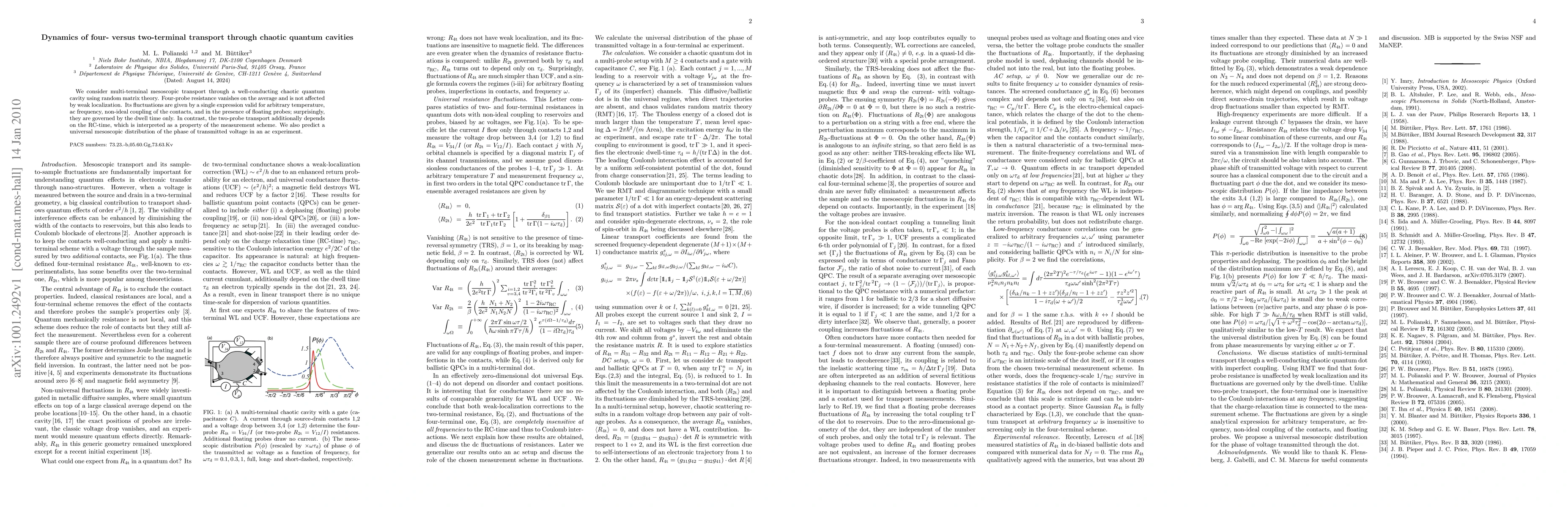 We consider multi-terminal mesoscopic transport through a well-conducting chaotic quantum cavity using random matrix theory. Four-probe resistance vanishes on the average and is not affected by weak localization. Its fluctuations are given by a single expression valid for arbitrary temperature, ac frequency, non-ideal coupling of the contacts, and in the presence of floating probes; surprisingly, they are governed by the dwell time only. In contrast, the two-probe transport additionally depends on the RC-time, which is interpreted as a property of the measurement scheme. We also predict a universal mesoscopic distribution of the phase of transmitted voltage in an ac experiment.