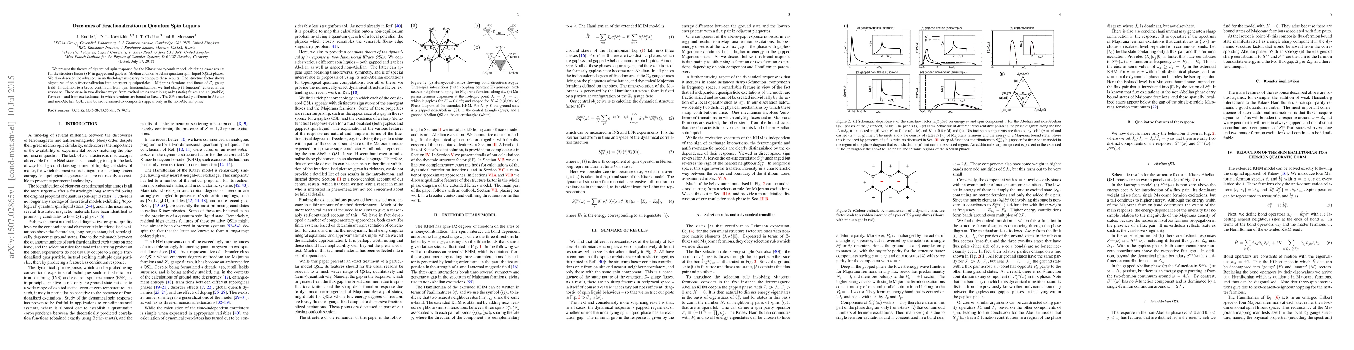 We present the theory of dynamical spin-response for the Kitaev honeycomb model, obtaining exact results for the structure factor (SF) in gapped and gapless, Abelian and non-Abelian quantum spin-liquid (QSL) phases. We also describe the advances in methodology necessary to compute these results. The structure factor shows signatures of spin-fractionalization into emergent quasiparticles -- Majorana fermions and fluxes of $Z_2$ gauge field. In addition to a broad continuum from spin-fractionalization, we find sharp ($\delta$-function) features in the response. These arise in two distinct ways: from excited states containing only (static) fluxes and no (mobile) fermions; and from excited states in which fermions are bound to fluxes. The SF is markedly different in Abelian and non-Abelian QSLs, and bound fermion-flux composites appear only in the non-Abelian phase.