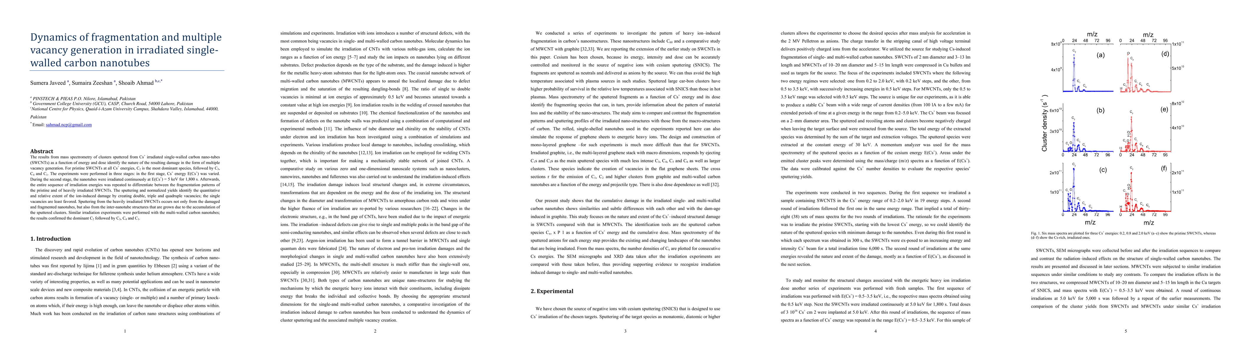 This research investigates the fragmentation and multiple vacancy generation in single-walled carbon nanotubes (SWCNTs) under Cs+ irradiation. Mass spectrometry reveals that C2 is the most common sputter species, followed by C3, C4, and C1, with single vacancies being the least favored. The study identifies the extent of ion-induced damage and fragmentation through sputtering, highlighting changes in damage patterns between pristine and heavily irradiated SWCNTs.