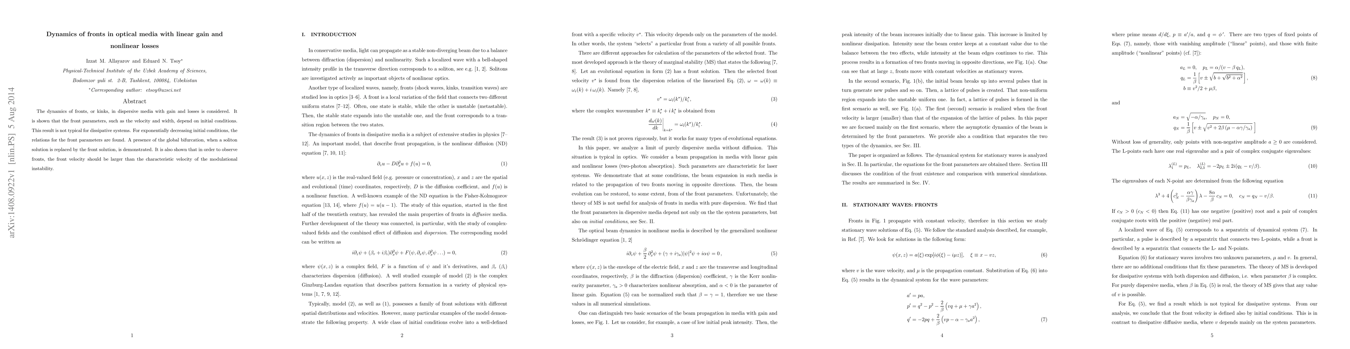 The dynamics of fronts, or kinks, in dispersive media with gain and losses is considered. It is shown that the front parameters, such as the velocity and width, depend on initial conditions. This result is not typical for dissipative systems. For exponentially decreasing initial conditions, the relations for the front parameters are found. A presence of the global bifurcation, when a soliton solution is replaced by the front solution, is demonstrated. It is also shown that in order to observe fronts, the front velocity should be larger than the characteristic velocity of the modulational instability.
