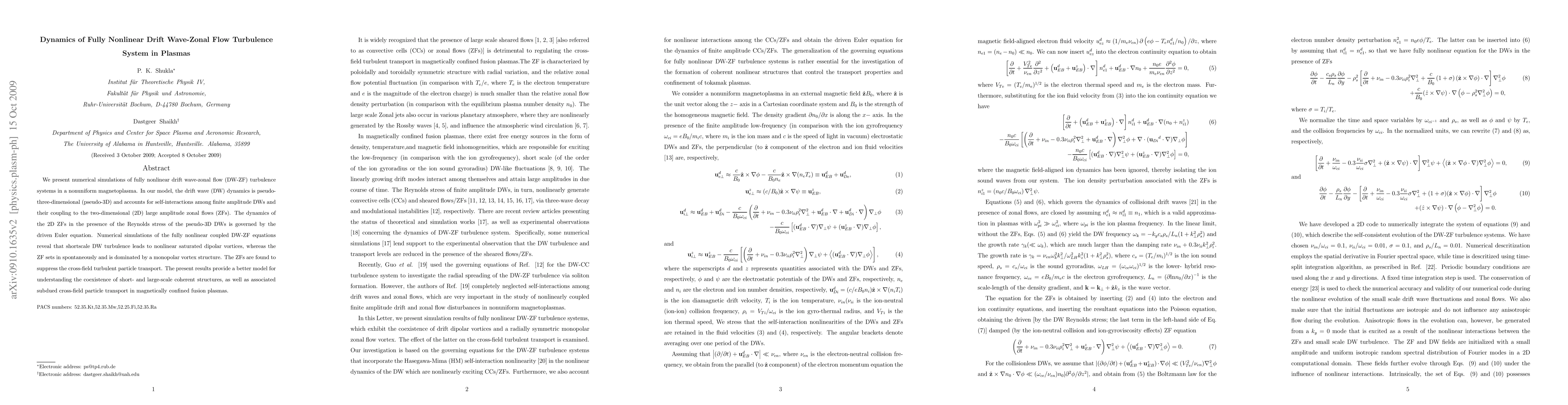 This paper presents numerical simulations of fully nonlinear drift wave-zonal flow turbulence in plasmas, showing that shortscale turbulence generates dipolar vortices while zonal flows create monopolar structures that suppress cross-field particle transport, enhancing understanding of coherent structures in fusion plasmas.