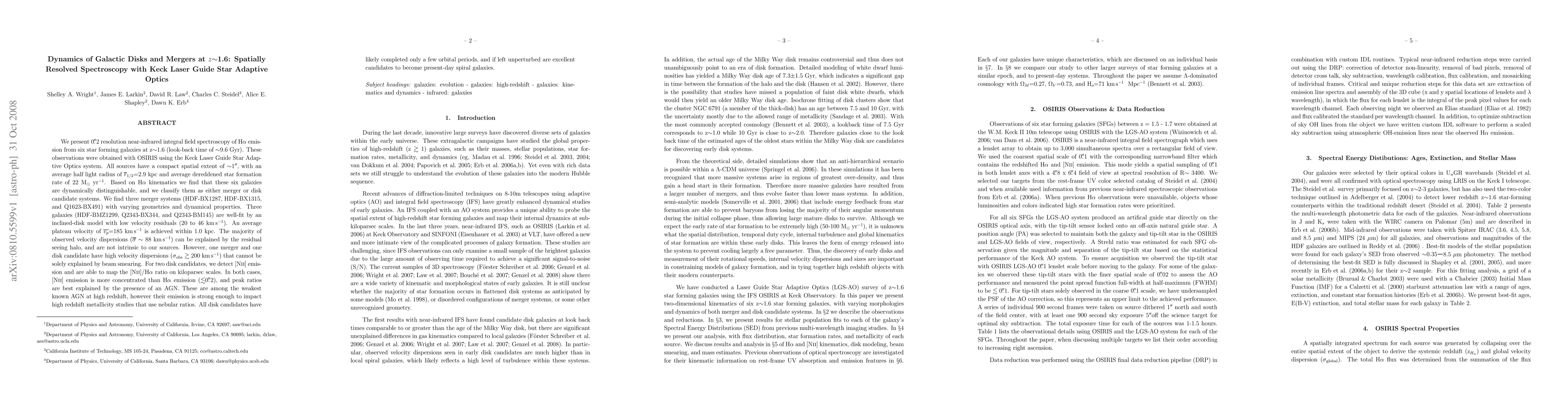 We present 0.2" resolution near-infrared integral field spectroscopy of H-alpha emission from six star forming galaxies at z~1.6 (look-back time of ~9.6 Gyr). These observations were obtained with OSIRIS using the Keck Laser Guide Star Adaptive Optics system. All sources have a compact spatial extent of ~1", with an average half light radius of r=2.9 kpc and average dereddened star formation rate of 22 Msolar per year. Based on H-alpha kinematics we find that these six galaxies are dynamically distinguishable, and we classify them as either merger or disk candidate systems. We find three merger systems (HDF-BX1287, HDF-BX1315, and Q1623-BX491) with varying geometries and dynamical properties. Three galaxies (HDF-BMZ1299, Q2343-BX344, and Q2343-BM145) are well-fit by an inclined-disk model with low velocity residuals (20 to 46 km/sec). An average plateau velocity of v_p=185 km/sec is achieved within 1.0 kpc. The majority of observed velocity dispersions (~88 km/sec) can be explained by the residual seeing halo, and are not intrinsic to our sources. However, one merger and one disk candidate have high velocity dispersions (> 200 km/sec) that cannot be solely explained by beam smearing. For two disk candidates, we detect [NII] emission and are able to map the [NII]/H-alpha ratio on kiloparsec scales. In both cases, [NII] emission is more concentrated than H-alpha emission (< 0.2"), and peak ratios are best explained by the presence of an AGN. These are among the weakest known AGN at high redshift, however their emission is strong enough to impact high redshift metallicity studies that use nebular ratios. All disk candidates have likely completed only a few orbital periods, and if left unperturbed are excellent candidates to become present-day spiral galaxies.