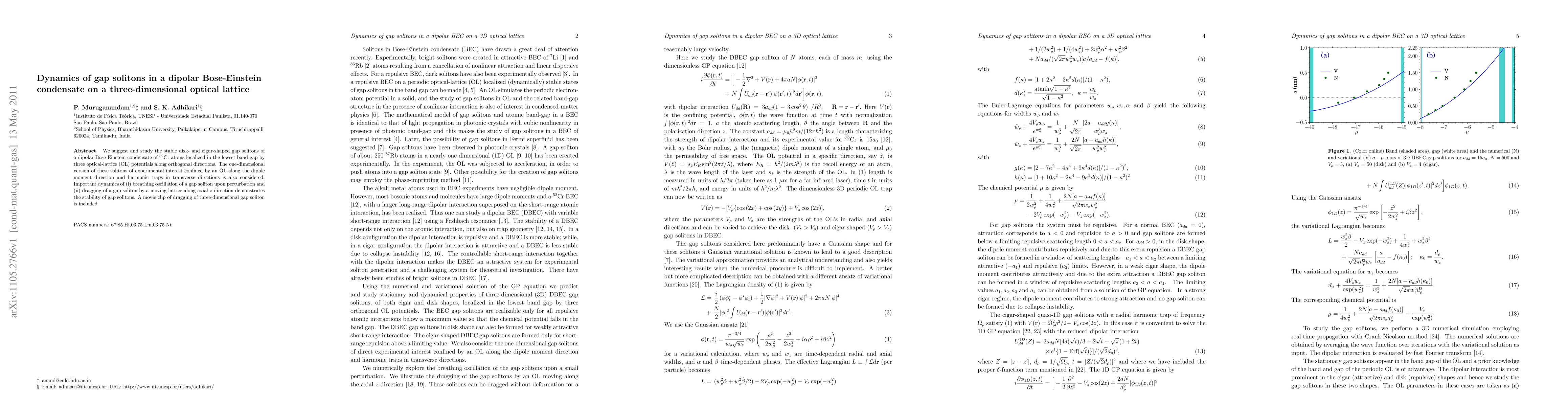 This paper investigates stable gap solitons in a dipolar Bose-Einstein condensate of $^{52}$Cr atoms within a three-dimensional optical lattice, focusing on their dynamics, including breathing oscillations and dragging by a moving lattice. The study also considers a one-dimensional version confined by an optical lattice along the dipole moment direction.