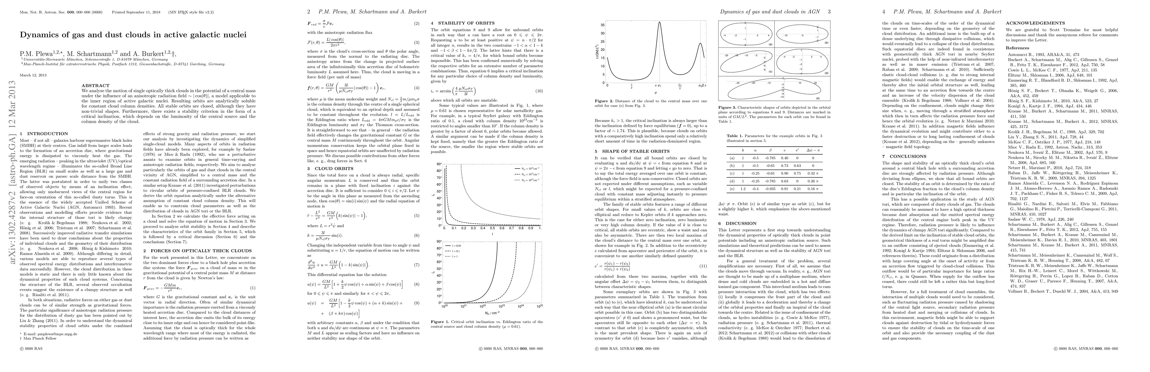 We analyse the motion of single optically thick clouds in the potential of a central mass under the influence of an anisotropic radiation field ~|cos(\theta)|, a model applicable to the inner region of active galactic nuclei. Resulting orbits are analytically soluble for constant cloud column densities. All stable orbits are closed, although they have non-trivial shapes. Furthermore, there exists a stability criterion in the form of a critical inclination, which depends on the luminosity of the central source and the column density of the cloud.