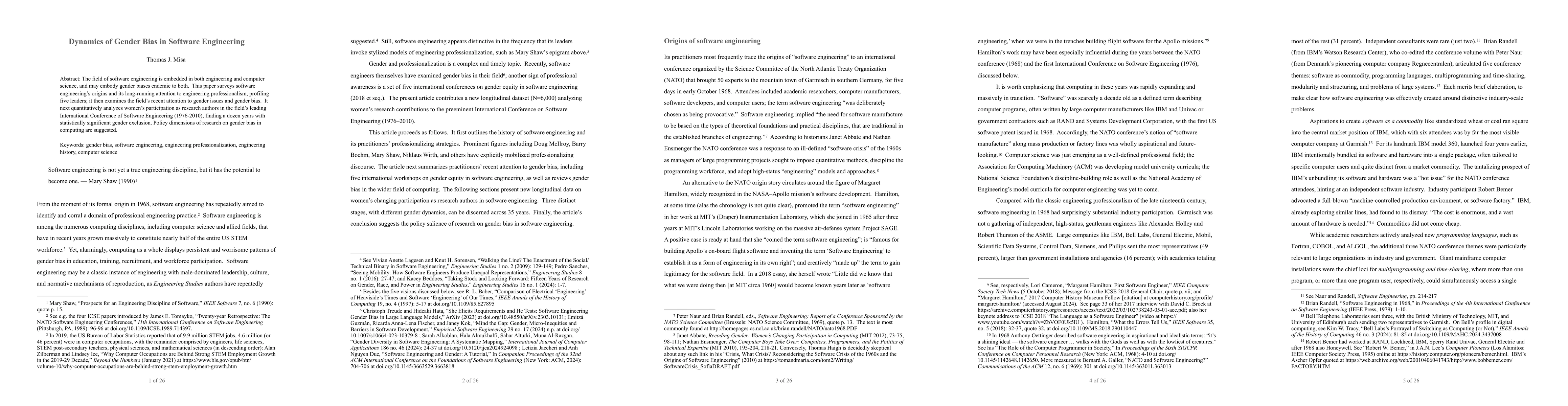 The field of software engineering is embedded in both engineering and computer science, and may embody gender biases endemic to both. This paper surveys software engineering's origins and its long-running attention to engineering professionalism, profiling five leaders; it then examines the field's recent attention to gender issues and gender bias. It next quantitatively analyzes women's participation as research authors in the field's leading International Conference of Software Engineering (1976-2010), finding a dozen years with statistically significant gender exclusion. Policy dimensions of research on gender bias in computing are suggested.