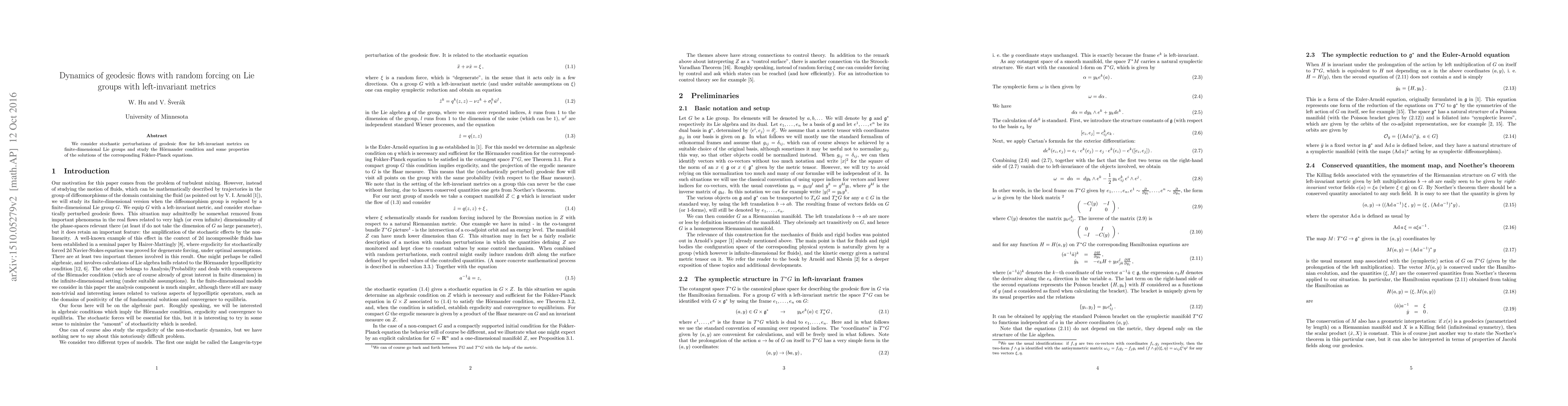 We consider stochastic perturbations of geodesic flow for left-invariant metrics on finite-dimensional Lie groups and study the H\"ormander condition and some properties of the solutions of the corresponding Fokker-Planck equations.