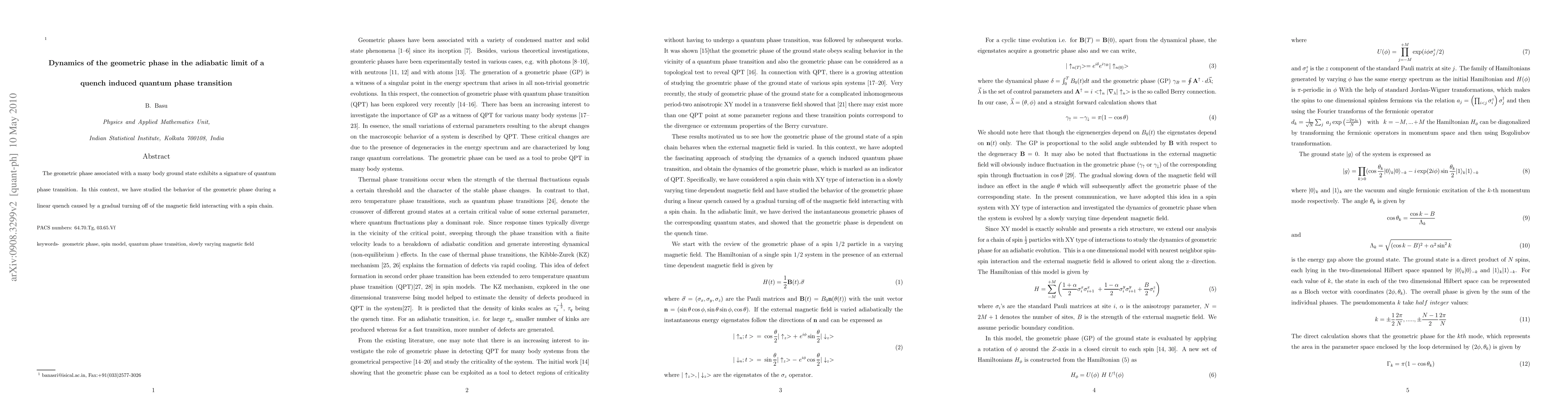 This paper investigates the geometric phase in a spin chain during a linear adiabatic quench, revealing its role as a signature of quantum phase transitions. The study focuses on how the geometric phase evolves as a magnetic field is gradually turned off.