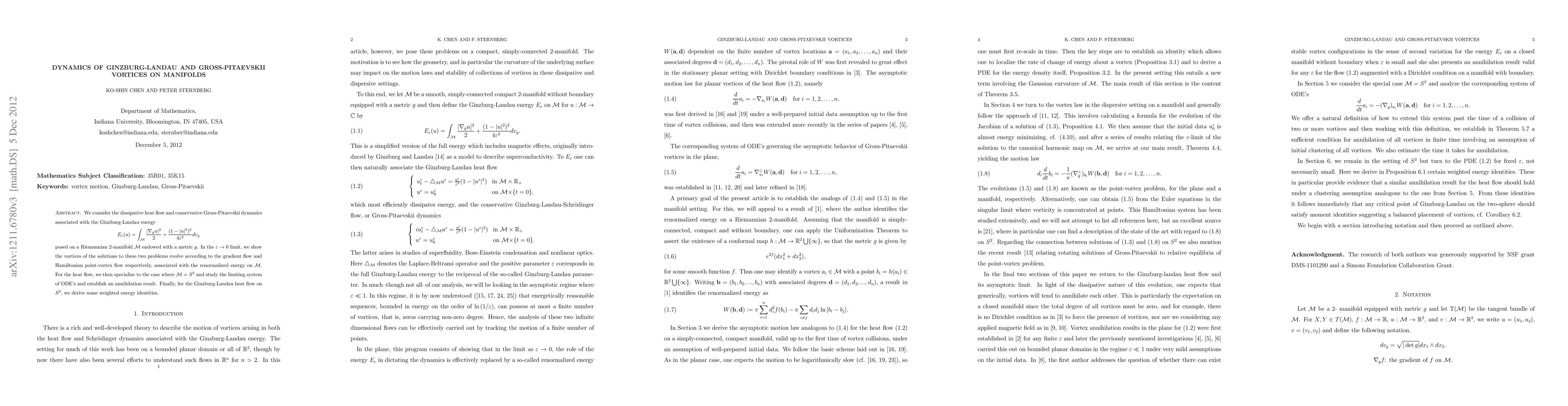 This paper investigates the dynamics of Ginzburg-Landau and Gross-Pitaevskii vortices on Riemannian 2-manifolds, showing their evolution according to gradient flow and Hamiltonian point-vortex flow. For the sphere case, it establishes an annihilation result and derives weighted energy identities for the Ginzburg-Landau heat flow.