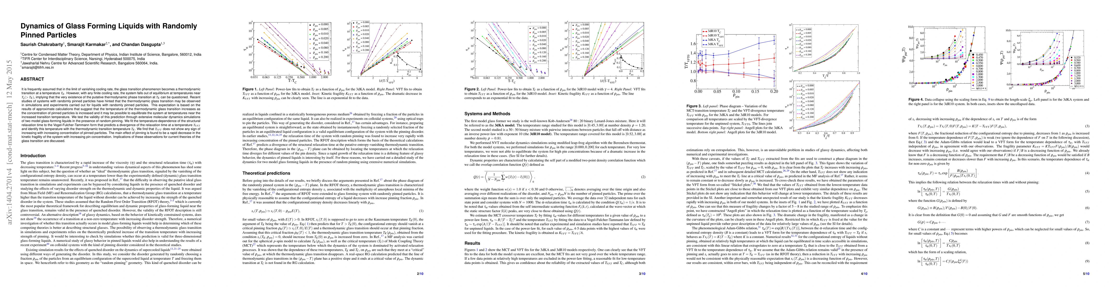 This paper investigates the dynamics of glass-forming liquids with randomly pinned particles, finding that the thermodynamic glass transition temperature $T_K$ does not increase with higher pin concentrations, contrary to predictions. Instead, pinning primarily reduces the kinetic fragility of the system. These results challenge existing theories regarding the glass transition.