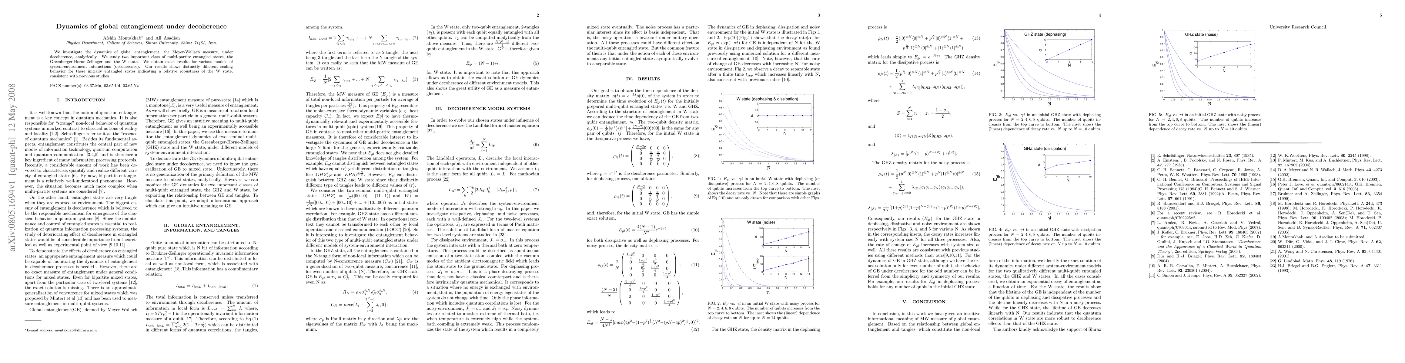 This paper analytically explores the dynamics of global entanglement, specifically the Meyer-Wallach measure, under decoherence for two classes of multi-partite entangled states: Greenberger-Horne-Zeilinger and W states. The study reveals distinct scaling behaviors, highlighting the relative robustness of W states compared to Greenberger-Horne-Zeilinger states under various decoherence models.