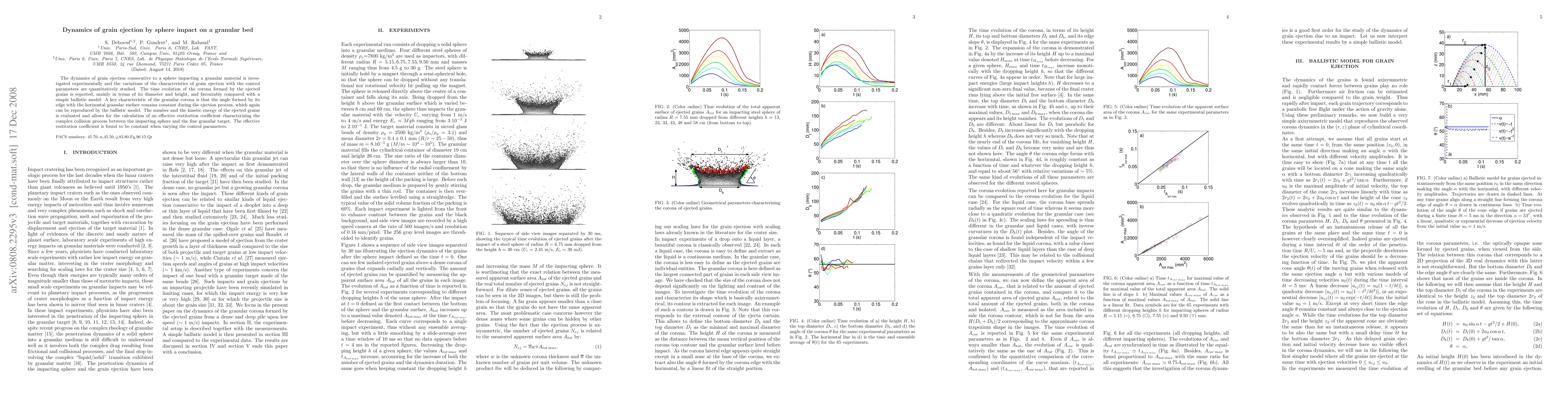 The dynamics of grain ejection consecutive to a sphere impacting a granular material is investigated experimentally and the variations of the characteristics of grain ejection with the control parameters are quantitatively studied. The time evolution of the corona formed by the ejected grains is reported, mainly in terms of its diameter and height, and favourably compared with a simple ballistic model. A key characteristic of the granular corona is that the angle formed by its edge with the horizontal granular surface remains constant during the ejection process, which again can be reproduced by the ballistic model. The number and the kinetic energy of the ejected grains is evaluated and allows for the calculation of an effective restitution coefficient characterizing the complex collision process between the impacting sphere and the fine granular target. The effective restitution coefficient is found to be constant when varying the control parameters.