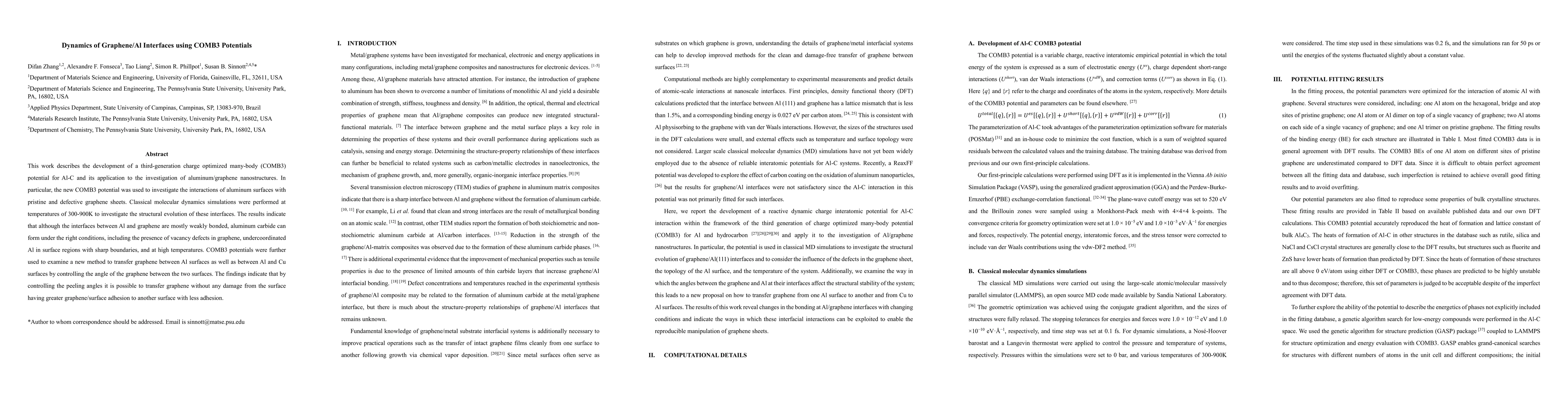 This work describes the development of a third-generation charge optimized many-body (COMB3) potential for Al-C and its application to the investigation of aluminum/graphene nanostructures. In particular, the new COMB3 potential was used to investigate the interactions of aluminum surfaces with pristine and defective graphene sheets. Classical molecular dynamics simulations were performed at temperatures of 300-900K to investigate the structural evolution of these interfaces. The results indicate that although the interfaces between Al and graphene are mostly weakly bonded, aluminum carbide can form under the right conditions, including the presence of vacancy defects in graphene, undercoordinated Al in surface regions with sharp boundaries, and at high temperatures. COMB3 potentials were further used to examine a new method to transfer graphene between Al surfaces as well as between Al and Cu surfaces by controlling the angle of the graphene between the two surfaces. The findings indicate that by controlling the peeling angles it is possible to transfer graphene without any damage from the surface having greater graphene/surface adhesion to another surface with less adhesion.