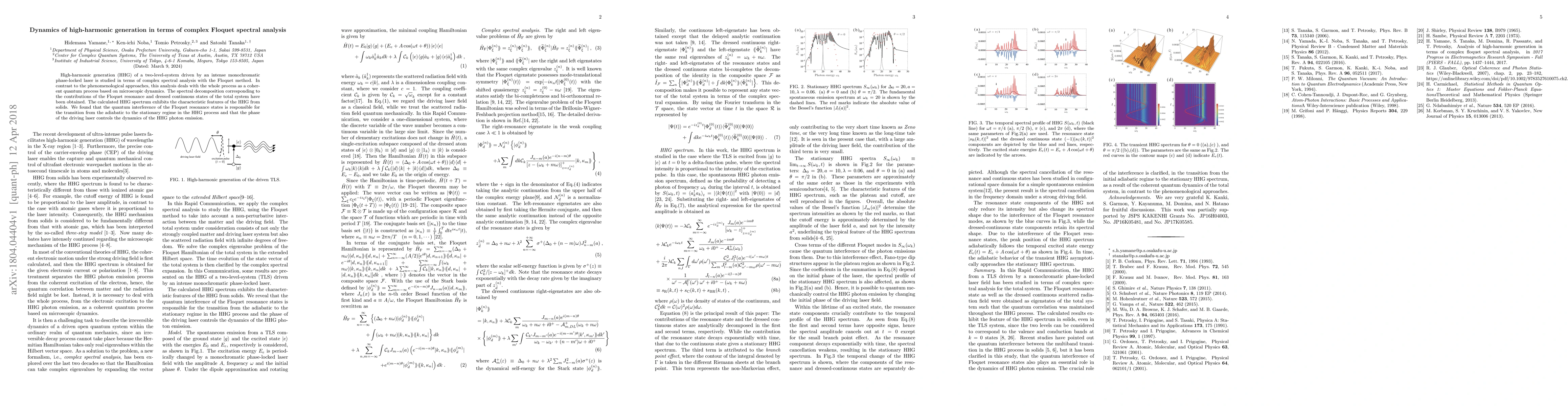 High-harmonic generation (HHG) of a two-level-system driven by an intense monochromatic phase-locked laser is studied in terms of complex spectral analysis with the Floquet method. In contrast to the phenomenological approaches, this analysis deals with the whole process as a coherent quantum process based on microscopic dynamics. The spectral decomposition corresponding to the contributions of the Floquet resonance and dressed continuous states of the total system have been obtained. The calculated HHG spectrum exhibits the characteristic features of the HHG from solids. We found that the quantum interference of the Floquet resonance states is responsible for the transition from the adiabatic to the stationary regime in the HHG process and that the phase of the driving laser controls the dynamics of the HHG photon emission.