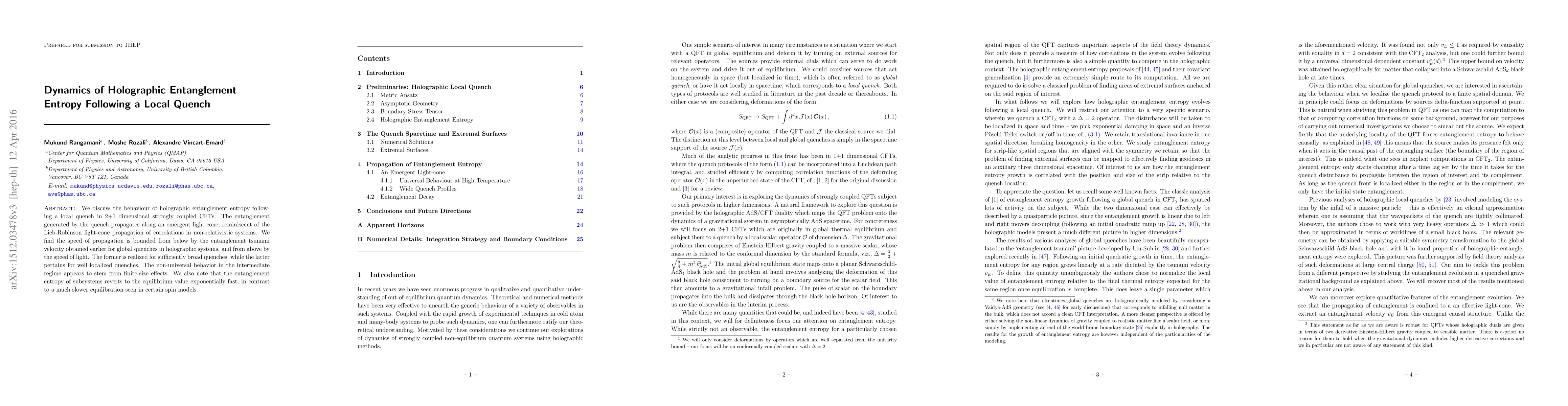 We discuss the behaviour of holographic entanglement entropy following a local quench in 2+1 dimensional strongly coupled CFTs. The entanglement generated by the quench propagates along an emergent light-cone, reminiscent of the Lieb-Robinson light-cone propagation of correlations in non-relativistic systems. We find the speed of propagation is bounded from below by the entanglement tsunami velocity obtained earlier for global quenches in holographic systems, and from above by the speed of light. The former is realized for sufficiently broad quenches, while the latter pertains for well localized quenches. The non-universal behavior in the intermediate regime appears to stem from finite-size effects. We also note that the entanglement entropy of subsystems reverts to the equilibrium value exponentially fast, in contrast to a much slower equilibration seen in certain spin models.