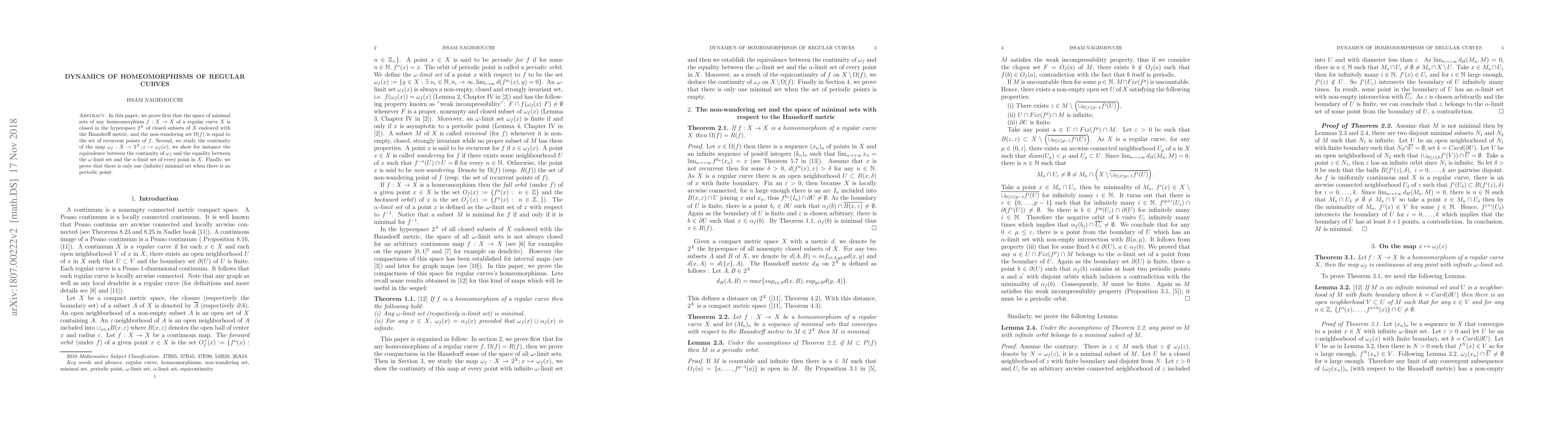 In this paper, we prove first that the space of minimal sets of any homeomorphisms $f:X\to X$ of a regular curve $X$ is closed in the hyperspace $2^X$ of closed subsets of $X$ endowed with the Hausdorff metric, and the non-wandering set $\Omega (f)$ is equal to the set of recurrent points of $f$. Second, we study the continuity of the map $\omega_f:X\to 2^X;x\mapsto \omega_f (x) $, we show for instance the equivalence between the continuity of $\omega_f $ and the equality between the $\omega$-limit set and the $\alpha $-limit set of every point in $X $. Finally, we prove that there is only one (infinite) minimal set when there is no periodic point.