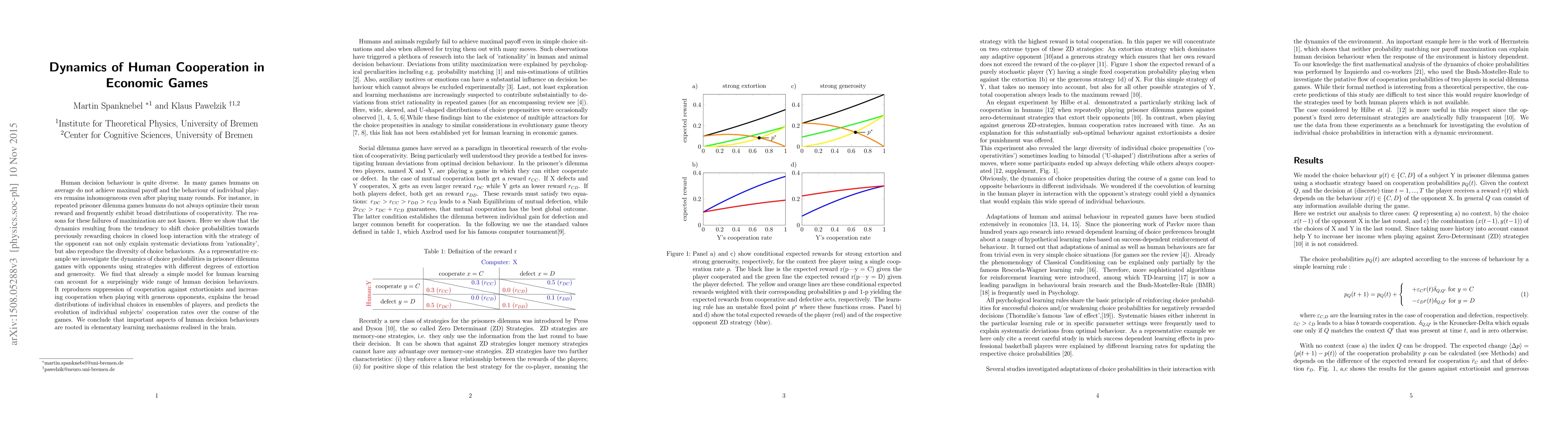 This research demonstrates that simple learning mechanisms can explain diverse human cooperative behaviors in economic games. By modeling choice probability shifts towards rewarding strategies, the study replicates suboptimal decisions and individual variability observed in prisoner dilemma games, accounting for cooperation suppression against extortionate opponents and increased cooperation with generous ones.