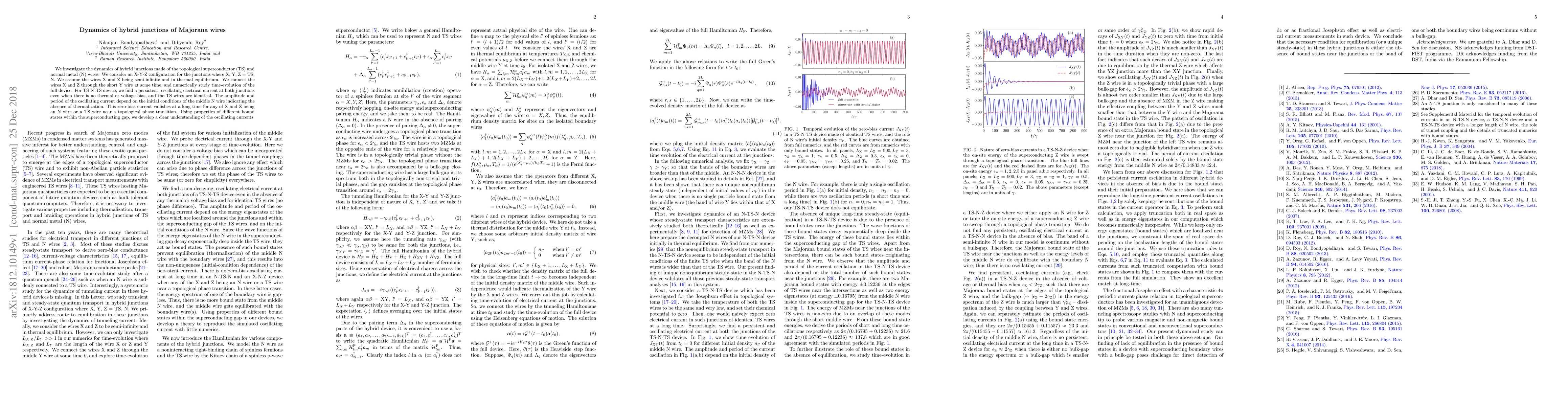 We investigate the dynamics of hybrid junctions made of the topological superconductor (TS) and normal metal (N) wires. We consider an X-Y-Z configuration for the junctions where X, Y, Z = TS, N. We assume the wires X and Z being semi-infinite and in thermal equilibrium. We connect the wires X and Z through the short Y wire at some time, and numerically study time-evolution of the full device. For TS-N-TS device, we find a persistent, oscillating electrical current at both junctions even when there is no thermal or voltage bias, and the TS wires are identical. The amplitude and period of the oscillating current depend on the initial conditions of the middle N wire indicating the absence of thermalization. This zero-bias current vanishes at a long time for any of X and Z being an N wire or a TS wire near a topological phase transition. Using properties of different bound states within the superconducting gap, we develop a clear understanding of the oscillating currents.