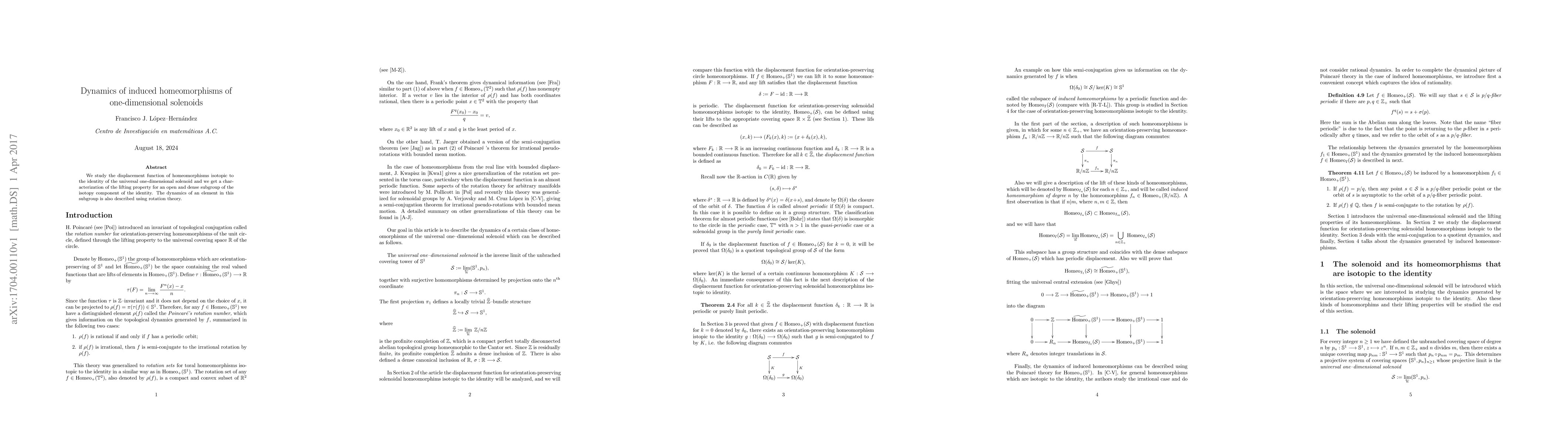 We study the displacement function of homeomorphisms isotopic to the identity of the universal one-dimensional solenoid and we get a characterization of the lifting property for an open and dense subgroup of the isotopy component of the identity. The dynamics of an element in this subgroup is also described using rotation theory.