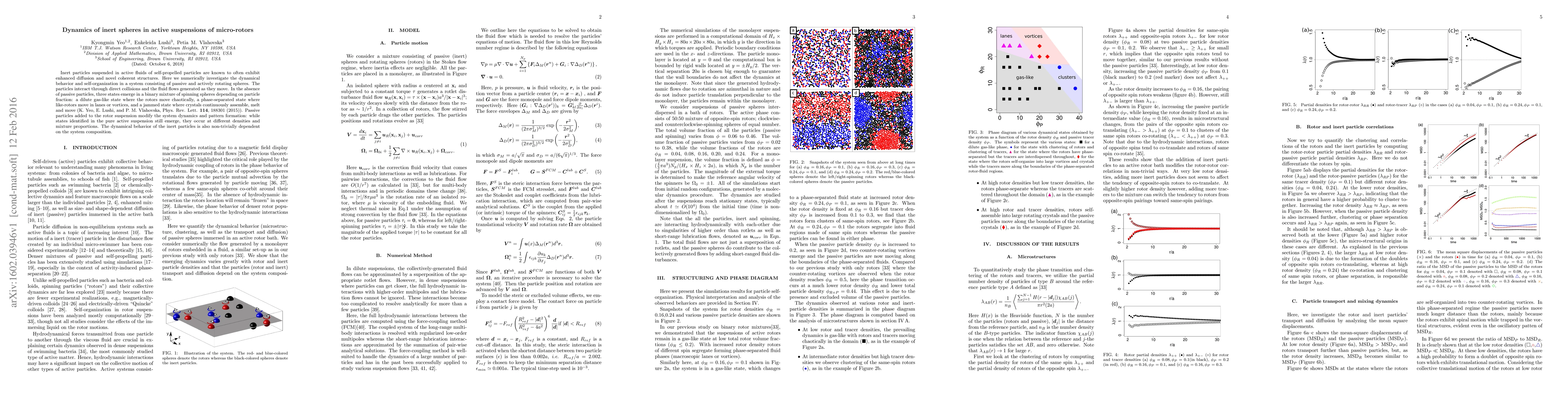 This paper numerically explores the dynamics and self-organization of inert spheres in active suspensions of self-propelled rotating particles, revealing how the presence of passive particles alters the system's states and the emergent coherent structures compared to the active-only suspension. The study identifies shifts in phase behavior and complex interactions between active and passive components.