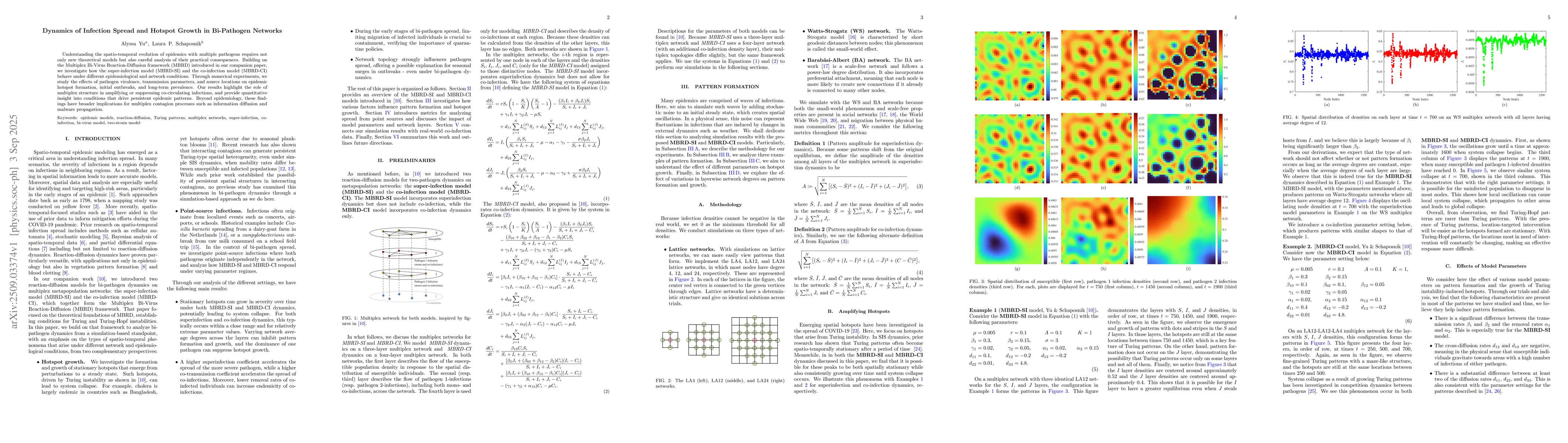 Understanding the spatio-temporal evolution of epidemics with multiple pathogens requires not only new theoretical models but also careful analysis of their practical consequences. Building on the Multiplex Bi-Virus Reaction-Diffusion framework (MBRD) introduced in our companion paper, we investigate how the super-infection model (MBRD-SI) and the co-infection model (MBRD-CI) behave under different epidemiological and network conditions. Through numerical experiments, we study the effects of pathogen virulence, diffusion rates, and cross-diffusion on epidemic hotspot formation and long-term prevalence. Our results highlight the role of multiplex structure in amplifying or suppressing co-circulating infections, and provide quantitative insight into conditions that drive persistent epidemic patterns. Beyond epidemiology, these findings have broader implications for multiplex contagion processes such as information diffusion and malware propagation.