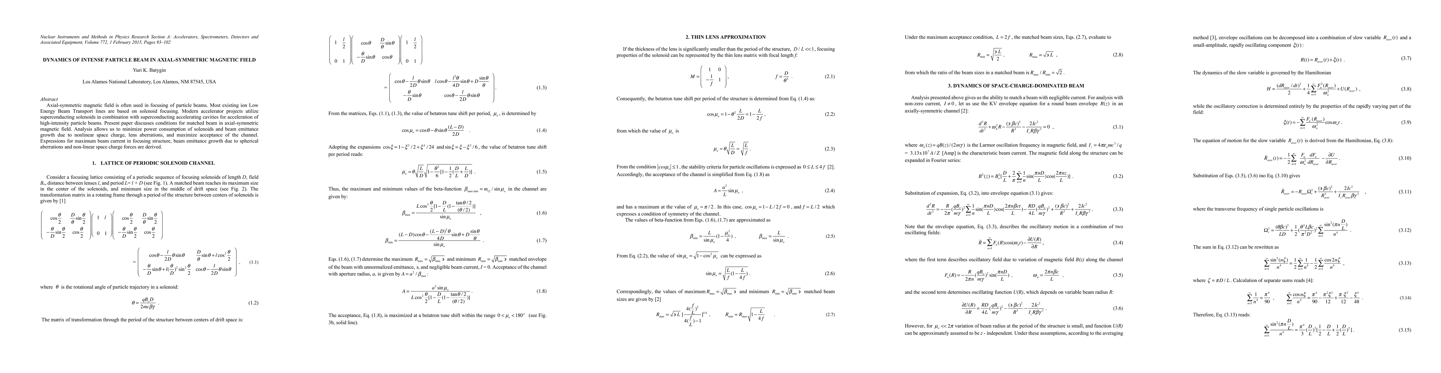 This paper investigates the dynamics of intense particle beams in axial-symmetric magnetic fields, focusing on optimizing beam focusing and minimizing power consumption. It derives expressions for maximum beam current, beam emittance growth, and methods to enhance channel acceptance.