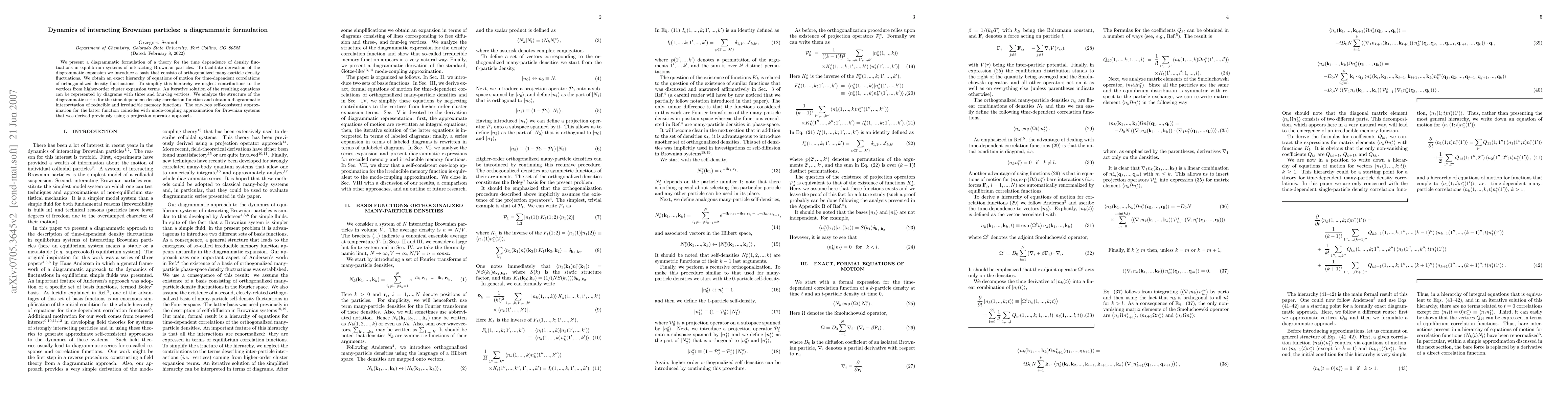 This paper introduces a diagrammatic formulation for the time-dependent density fluctuations in equilibrium systems of interacting Brownian particles, utilizing orthogonalized many-particle density fluctuations and simplifying the hierarchy of equations through the neglect of higher-order terms. The resulting diagrammatic series provides insights into reducible and irreducible memory functions, aligning with the mode-coupling approximation.