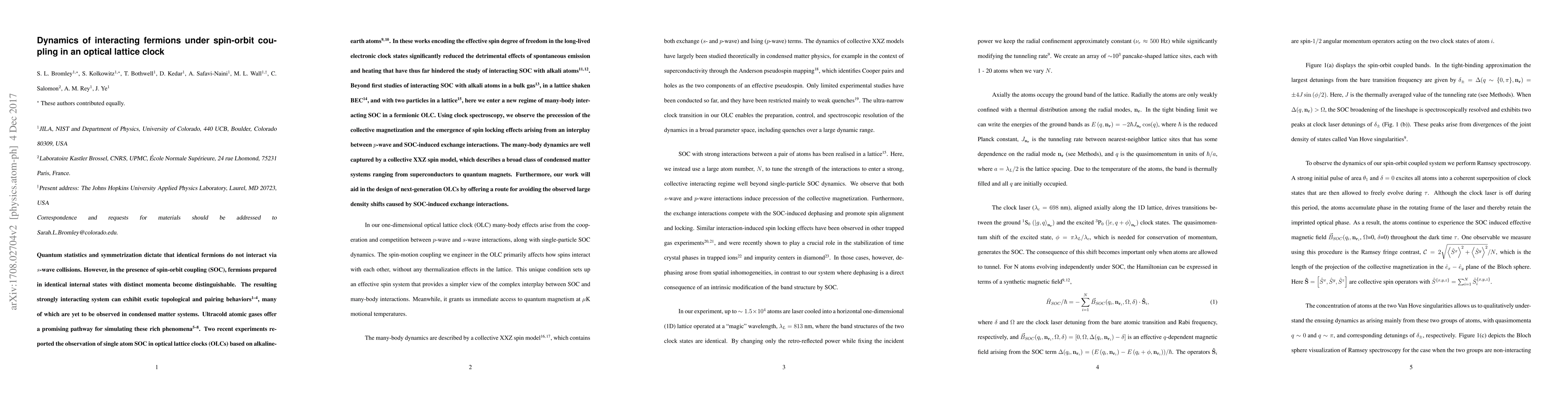This paper investigates the dynamics of interacting fermions under spin-orbit coupling in optical lattice clocks, revealing exotic topological and pairing behaviors due to distinguishable fermions with distinct momenta. The study observes collective magnetization precession and spin locking effects, modeled by a collective XXZ spin model, and suggests a method to mitigate density shifts in next-generation optical lattice clocks.