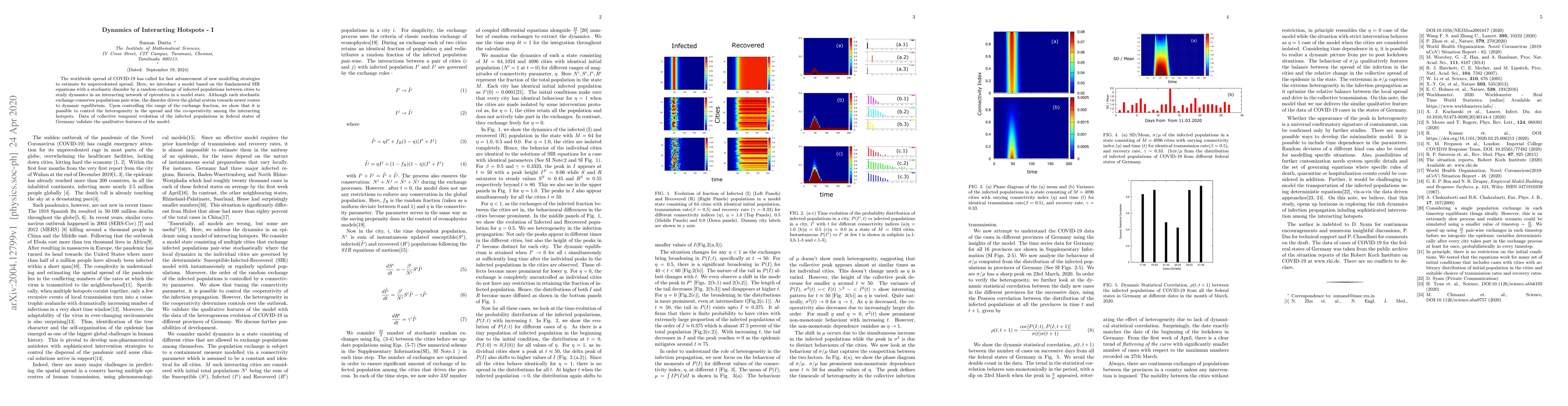 The worldwide spread of COVID-19 has called for fast advancement of new modelling strategies to estimate its unprecedented spread. Here, we introduce a model based on the fundamental SIR equations with a stochastic disorder by a random exchange of infected populations between cities to study dynamics in an interacting network of epicentres in a model state. Although each stochastic exchange conserves populations pair-wise, the disorder drives the global system towards newer routes to dynamic equilibrium. Upon controlling the range of the exchange fraction, we show that it is possible to control the heterogeneity in the spread and the co-operativity among the interacting hotspots. Data of collective temporal evolution of the infected populations in federal states of Germany validate the qualitative features of the model.