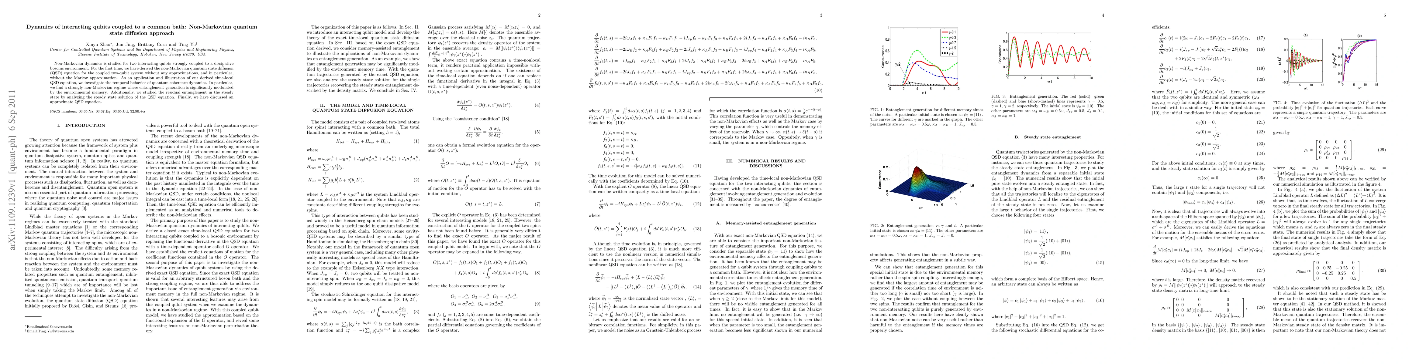 Non-Markovian dynamics is studied for two interacting quibts strongly coupled to a dissipative bosonic environment. For the first time, we have derived the non-Markovian quantum state diffusion (QSD) equation for the coupled two-qubit system without any approximations, and in particular, without the Markov approximation. As an application and illustration of our derived time-local QSD equation, we investigate the temporal behavior of quantum coherence dynamics. In particular, we find a strongly non-Markovian regime where entanglement generation is significantly modulated by the environmental memory. Additionally, we studied the residual entanglement in the steady state by analyzing the steady state solution of the QSD equation. Finally, we have discussed an approximate QSD equation.