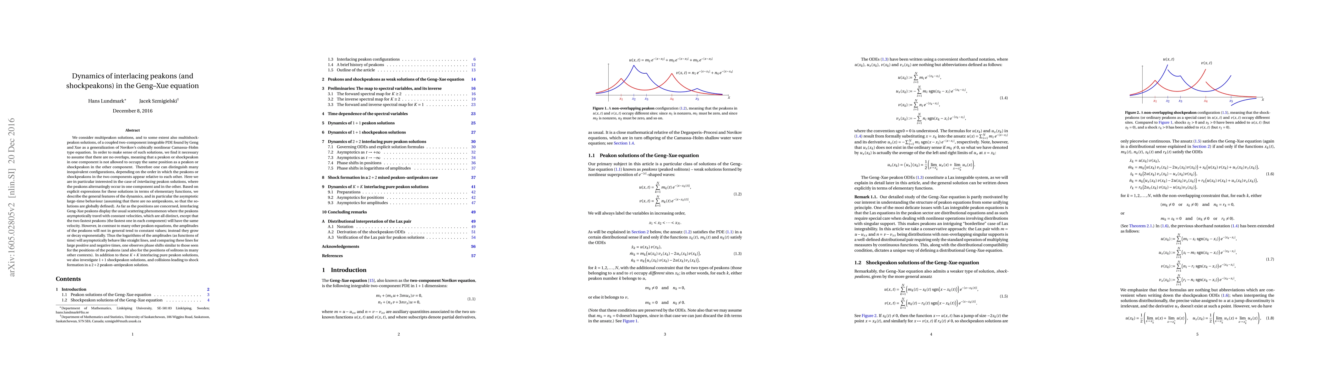 We consider multipeakon solutions, and to some extent also multishockpeakon solutions, of a coupled two-component integrable PDE found by Geng and Xue as a generalization of Novikov's cubically nonlinear Camassa-Holm type equation. In order to make sense of such solutions, we find it necessary to assume that there are no overlaps, meaning that a peakon or shockpeakon in one component is not allowed to occupy the same position as a peakon or shockpeakon in the other component. Therefore one can distinguish many inequivalent configurations, depending on the order in which the peakons or shockpeakons in the two components appear relative to each other. Here we are in particular interested in the case of interlacing peakon solutions, where the peakons alternatingly occur in one component and in the other. Based on explicit expressions for these solutions in terms of elementary functions, we describe the general features of the dynamics, and in particular the asymptotic large-time behaviour. As far as the positions are concerned, interlacing Geng-Xue peakons display the usual scattering phenomenon where the peakons asymptotically travel with constant velocities, which are all distinct, except that the two fastest peakons will have the same velocity. However, in contrast to many other peakon equations, the amplitudes of the peakons will not in general tend to constant values; instead they grow or decay exponentially. Thus the logarithms of the amplitudes (as functions of time) will asymptotically behave like straight lines, and comparing these lines for large positive and negative times, one observes phase shifts similar to those seen for the positions of the peakons. In addition to these K+K interlacing pure peakon solutions, we also investigate 1+1 shockpeakon solutions, and collisions leading to shock formation in a 2+2 peakon-antipeakon solution.
