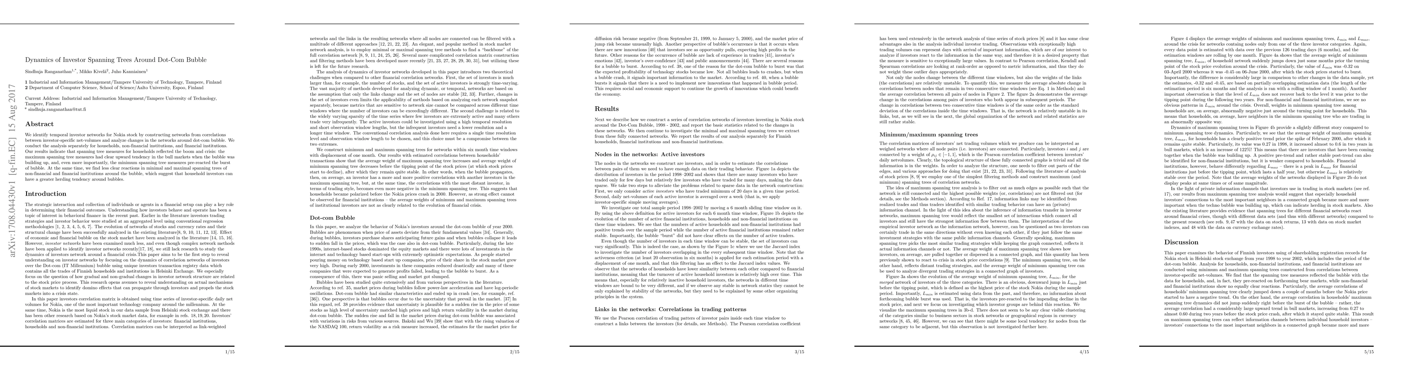 We identify temporal investor networks for Nokia stock by constructing networks from correlations between investor-specific net-volumes and analyze changes in the networks around dot-com bubble. We conduct the analysis separately for households, non-financial institutions, and financial institutions. Our results indicate that spanning tree measures for households reflected the boom and crisis: the maximum spanning tree measures had clear upward tendency in the bull markets when the bubble was building up, and, even more importantly, the minimum spanning tree measures pre-reacted the burst of bubble. At the same time, we find less clear reactions in minimal and maximal spanning trees of non-financial and financial institutions around the bubble, which suggest that household investors can have a greater herding tendency around bubbles.