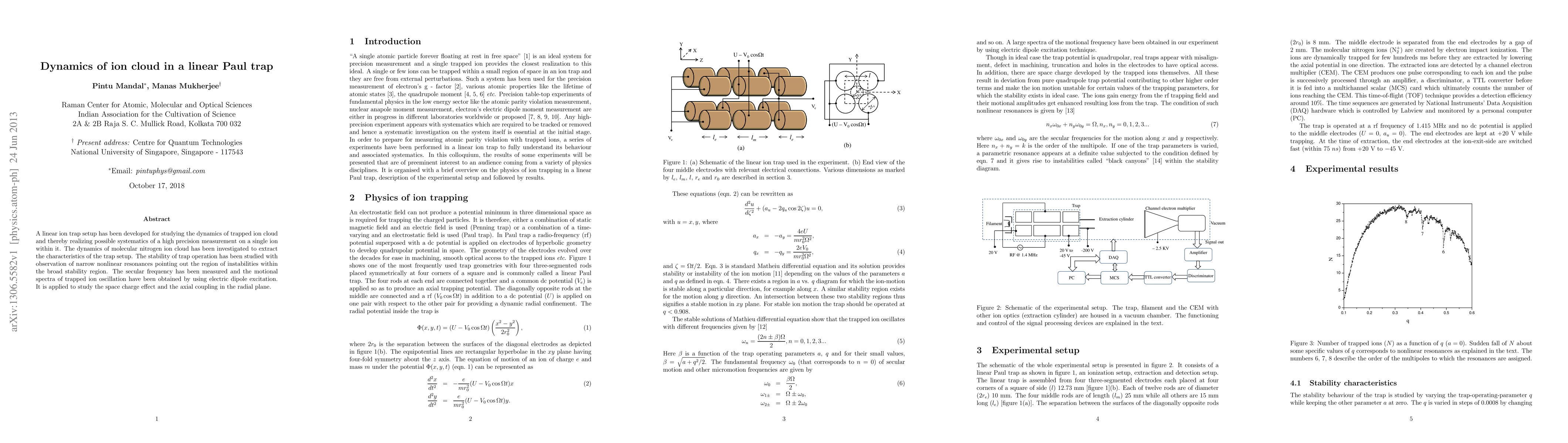 A linear ion trap setup has been developed for studying the dynamics of trapped ion cloud and thereby realizing possible systematics of a high precision measurement on a single ion within it. The dynamics of molecular nitrogen ion cloud has been investigated to extract the characteristics of the trap setup. The stability of trap operation has been studied with observation of narrow nonlinear resonances pointing out the region of instabilities within the broad stability region. The secular frequency has been measured and the motional spectra of trapped ion oscillation have been obtained by using electric dipole excitation. It is applied to study the space charge effect and the axial coupling in the radial plane.