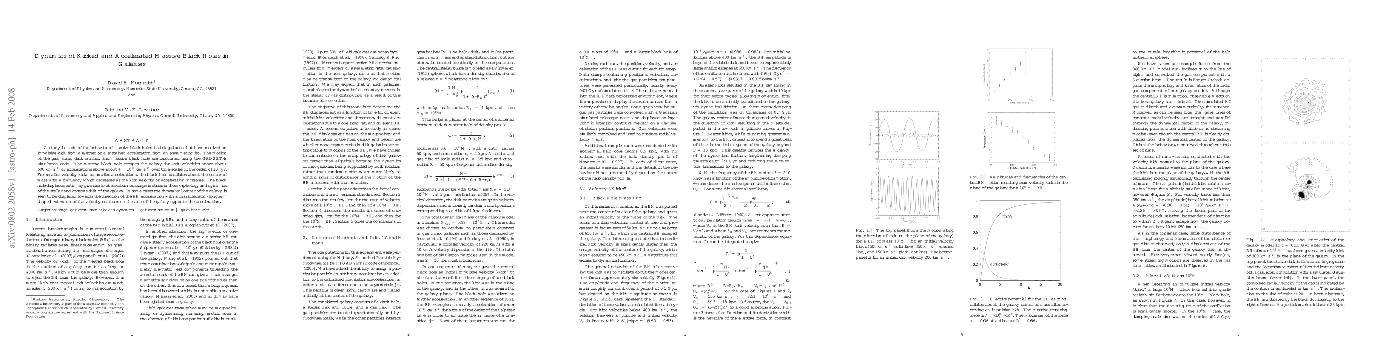 A study is made of the behavior of massive black holes in disk galaxies that have received an impulsive kick from a merger or a sustained acceleration from an asymmetric jet. The motion of the gas, stars, dark matter, and massive black hole are calculated using the GADGET-2 simulation code. The massive black hole escapes the galaxy for kick velocities above about 600 km/s or accelerations above about 4*10^{-8} cm/s^2 over time-scales of the order of 10^8 yr. For smaller velocity kicks or smaller accelerations, the black hole oscillates about the center of mass with a frequency which decreases as the kick velocity or acceleration increases. The black hole displacements may give rise to observable nonaxisymmetries in the morphology and dynamics of the stellar and gaseous disk of the galaxy. In some cases the dynamical center of the galaxy is seen to be displaced towards the direction of the BH acceleration with a characteristic ``tongue--'' shaped extension of the velocity contours on the side of the galaxy opposite the acceleration.