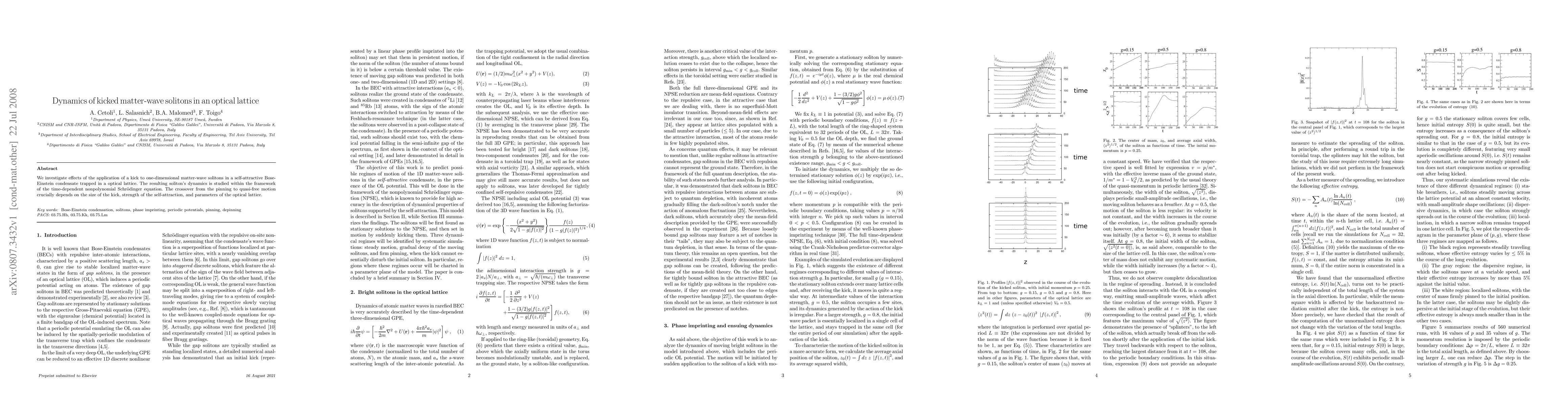 This study examines how a kick affects the dynamics of one-dimensional solitons in a Bose-Einstein condensate within an optical lattice, revealing a transition from pinned to quasi-free motion dependent on the kick size, self-attraction strength, and lattice parameters. The analysis uses the time-dependent nonpolynomial Schrödinger equation.