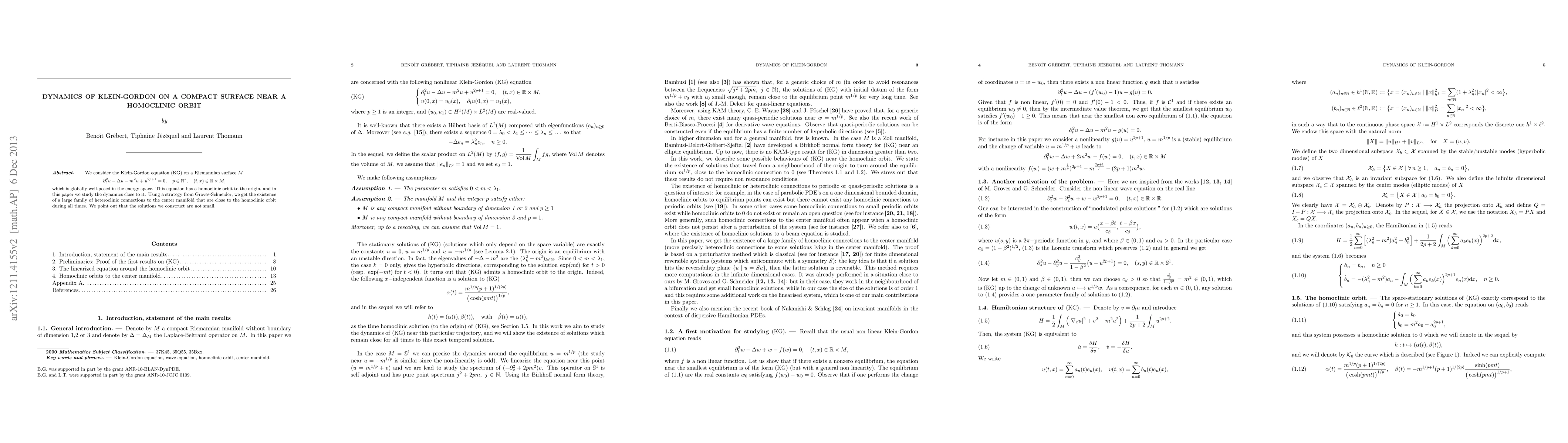 We consider the Klein-Gordon equation on a Riemannian surface which is globally well-posed in the energy space. This equation has an homoclinic orbit to the origin, and in this paper we study the dynamics close to it. Using a strategy from Groves-Schneider, we show that there are many solutions which stay close to this homocline during all times. We point out that the solutions we construct are not small.
