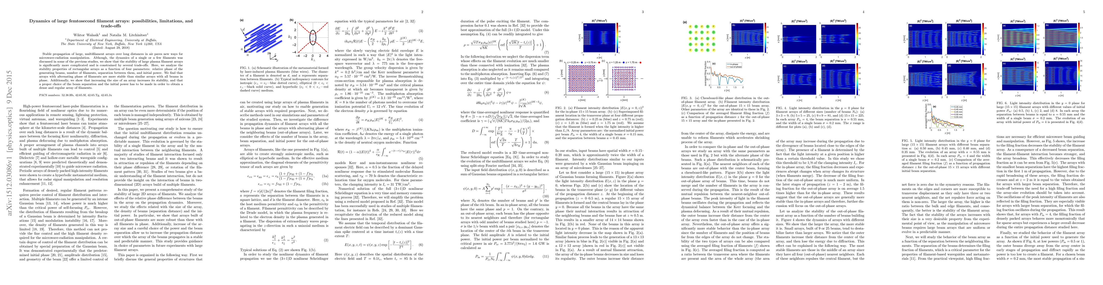 Stable propagation of large, multifilament arrays over long distances in air paves new ways for microwave-radiation manipulation. Although, the dynamics of a single or a few filaments was discussed in some of the previous studies, we show that the stability of large plasma filament arrays is significantly more complicated and is constrained by several trade-offs. Here, we analyze the stability properties of rectangular arrays as a function of four parameters: relative phase of the generating beams, number of filaments, separation between them, and initial power. We find that arrays with alternating phase of filaments are more stable than similar arrays with all beams in phase. Additionally, we show that increasing the size of an array increases its stability, and that a proper choice of the beam separation and the initial power has to be made in order to obtain a dense and regular array of filaments.
