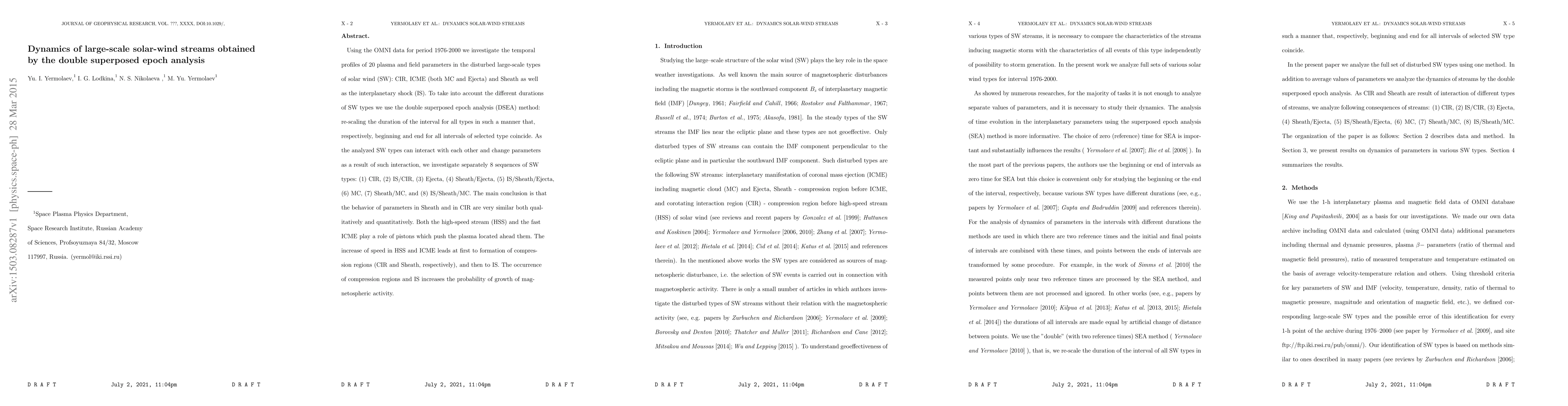 This study uses the double superposed epoch analysis (DSEA) method on OMNI data from 1976-2000 to analyze temporal profiles of 20 plasma and field parameters in large-scale solar wind types. The main finding is that Sheath and CIR types exhibit similar behavior, while high-speed streams and fast ICMEs act as pistons, leading to compression regions and shocks that enhance magnetospheric activity.