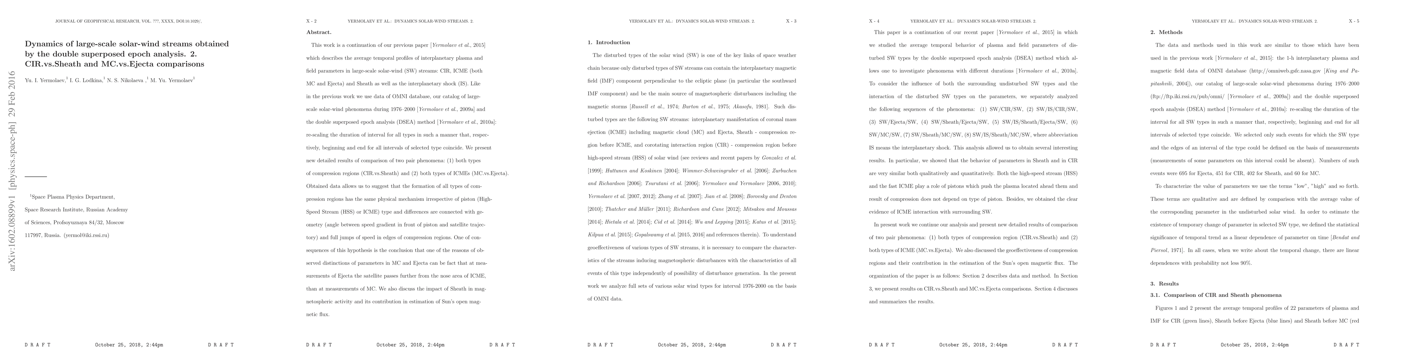 This work is a continuation of our previous paper [Yermolaevetal2015] which describes the average temporal profiles of interplanetary plasma and field parameters in large-scale solar-wind (SW) streams: CIR, ICME (both MC and Ejecta) and Sheath as well as the interplanetary shock (IS). Like in the previous work we use data of OMNI database, our catalog of large-scale solar-wind phenomena during 1976--2000 [Yermolaevetal2009] and the double superposed epoch analysis (DSEA) method [Yermolaevetal2010]: re-scaling the duration of interval for all types in such a manner that, respectively, beginning and end for all intervals of selected type coincide. We present new detailed results of comparison of two pair phenomena: (1) both types of compression regions (CIR.vs.Sheath) and (2) both types of ICMEs (MC.vs.Ejecta). Obtained data allows us to suggest that the formation of all types of compression regions has the same physical mechanism irrespective of piston (High-Speed Stream (HSS) or ICME) type and differences are connected with geometry (angle between speed gradient in front of piston and satellite trajectory) and full jumps of speed in edges of compression regions. One of consequences of this hypothesis is the conclusion that one of the reasons of observed distinctions of parameters in MC and Ejecta can be fact that at measurements of Ejecta the satellite passes further from the nose area of ICME, than at measurements of MC. We also discuss the impact of Sheath in magnetospheric activity and its contribution in estimation of Sun's open magnetic flux.