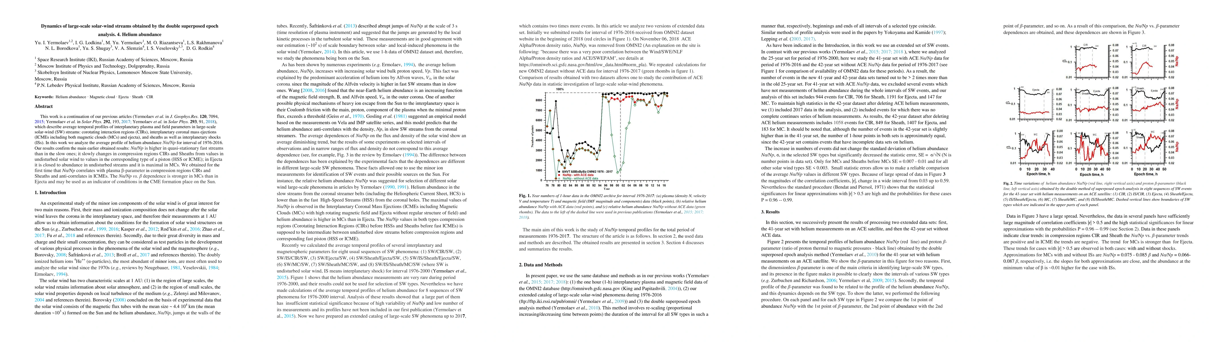 This work is a continuation of our previous articles (Yermolaev et al. in J. Geophys. Res. 120, 7094, 2015; Yermolaev et al. in Solar Phys. 292, 193, 2017; Yermolaev et al. in Solar Phys. 293, 91, 2018), which describe the average temporal profiles of interplanetary plasma and field parameters in large-scale solar-wind (SW) streams: corotating interaction regions (CIRs), interplanetary coronal mass ejections (ICMEs including both magnetic clouds (MCs) and ejecta), and sheaths as well as interplanetary shocks (ISs). In this work we analyze the average profile of helium abundance N{\alpha}/Np for interval of 1976-2016. Our results confirm main early obtained results: N{\alpha}/Np is higher in quasi-stationary fast streams than in slow ones; it slowly changes in compression regions CIRs and Sheaths from values in undisturbed solar wind to values in corresponding type of piston (HSS or ICME); in Ejecta it is closed to abundance in undisturbed streams and it is maximal in MCs. We obtained for first time that N{\alpha}/Np correlates with plasma {\beta}-parameter in compression regions CIRs and Sheaths and anti-correlates in ICMEs. The N{\alpha}/Np vs. {\beta} dependence is stronger in MCs than in Ejecta and may be used as an indicator of conditions in CME formation place on the Sun.